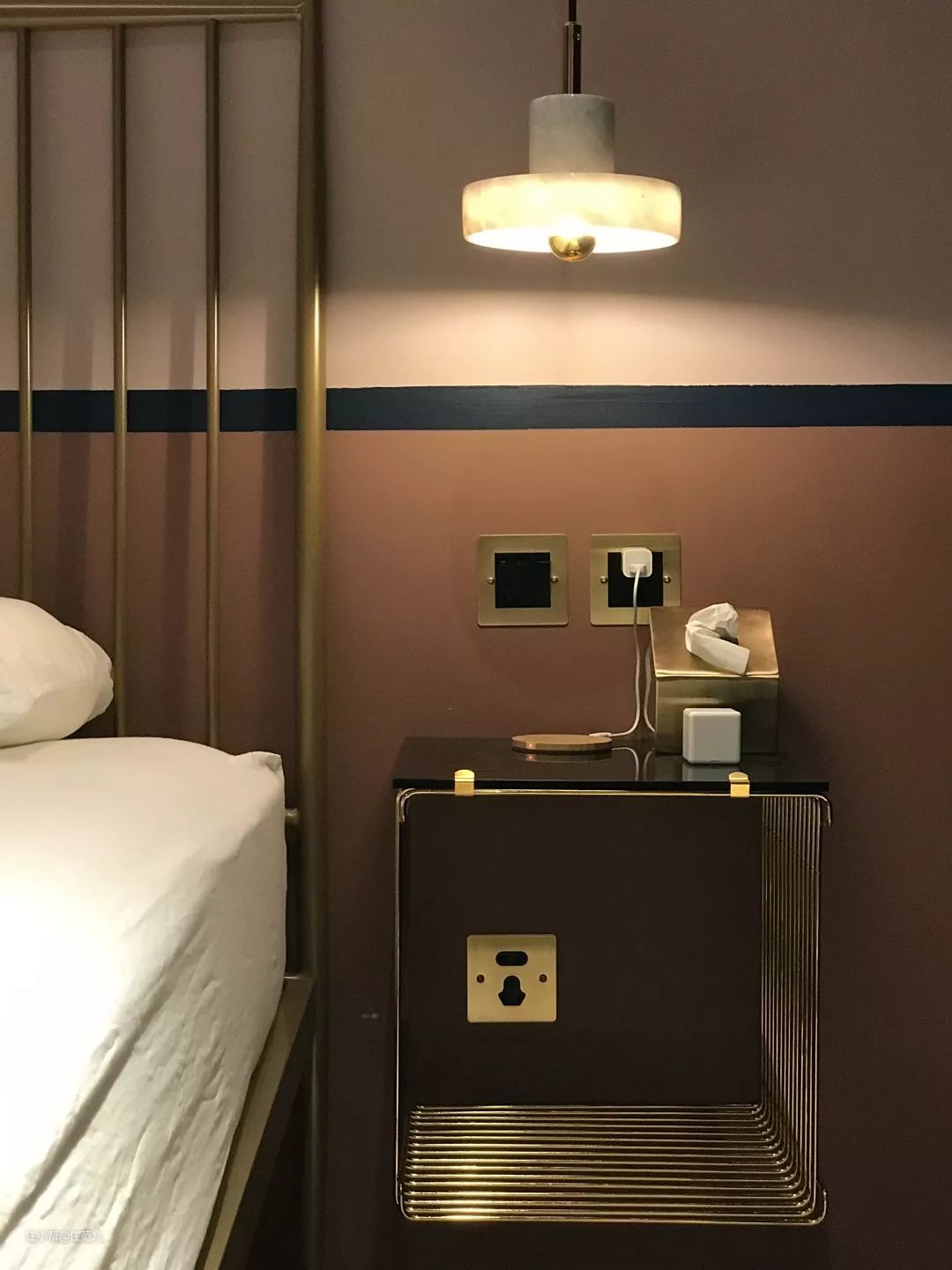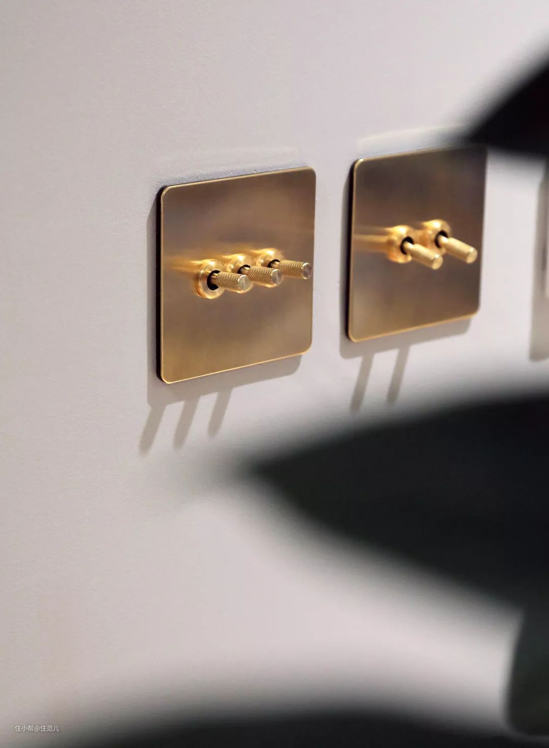 床头选择了黄铜质感的几何线条元素床头几,固定在墙上简约轻盈。黄铜色开关与金色床头线条元素呼应,细节满分。