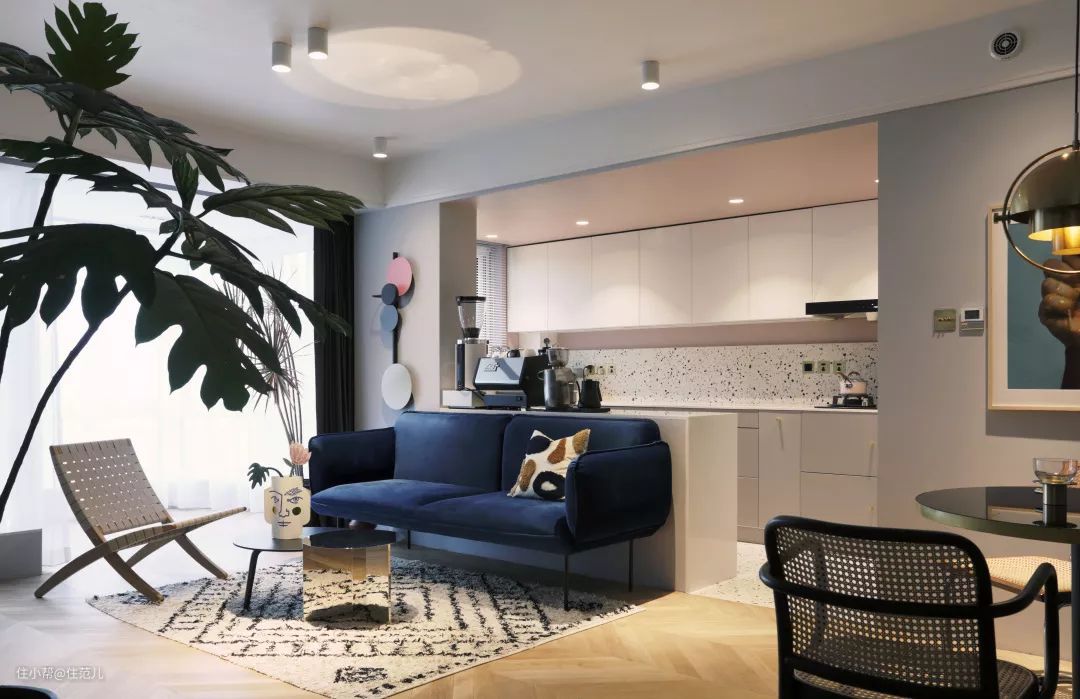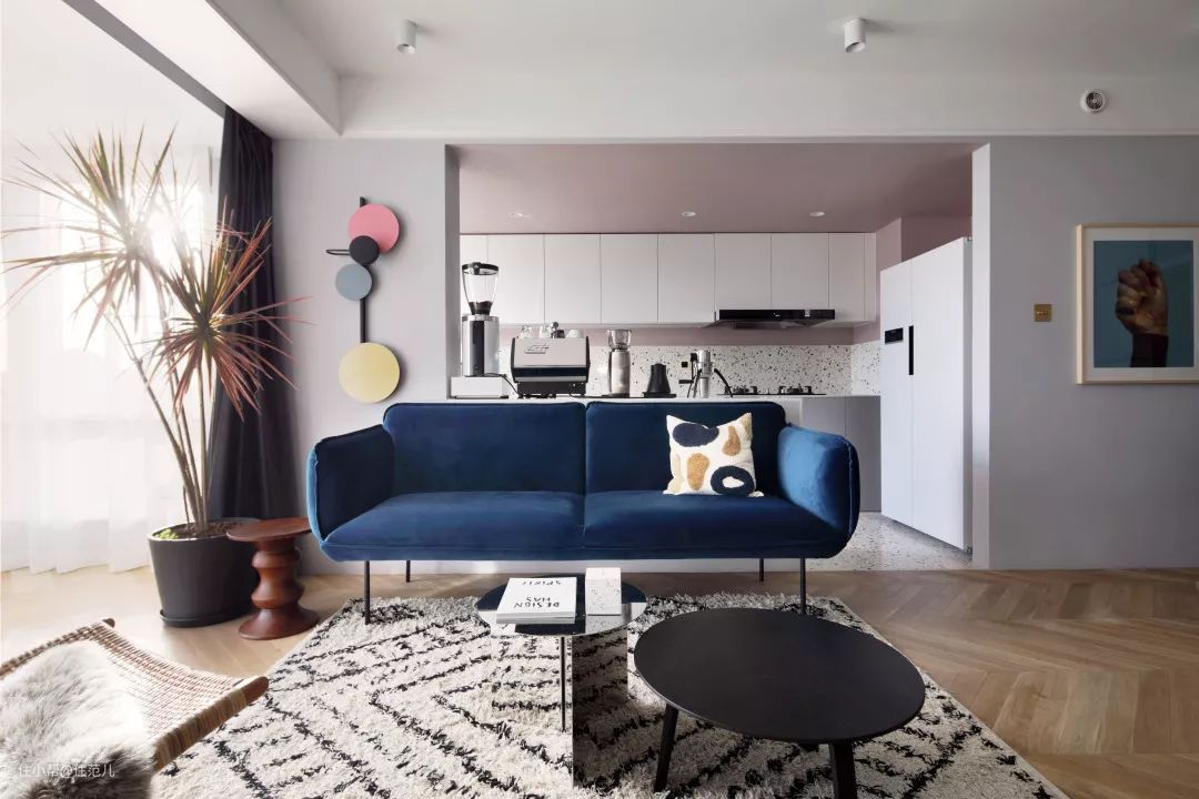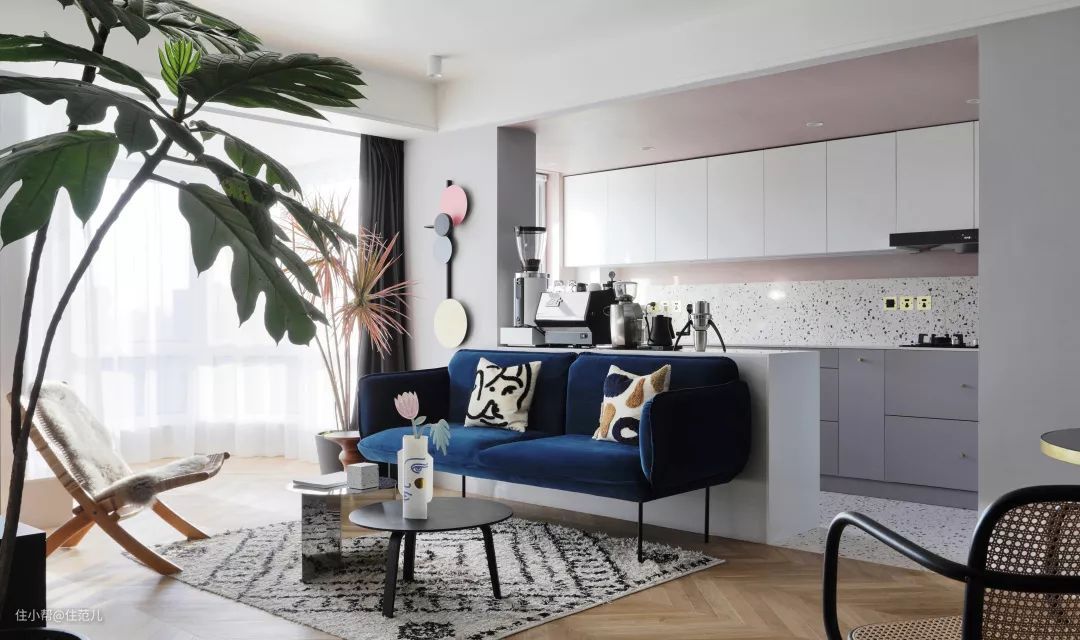 沙发挑选了一款简约的深蓝细腿沙发,视线没有阻挡显得轻盈又好打扫卫生。脏粉色厨房墙面与沙发后灰色墙面的色彩装饰搭配,整体看上去年轻充满活力。墙面颜色与厨房地柜颜色保持一致。这里特别说下,选完墙面色号寄给橱柜厂家打样,就能做出与墙面颜色一致的橱柜了