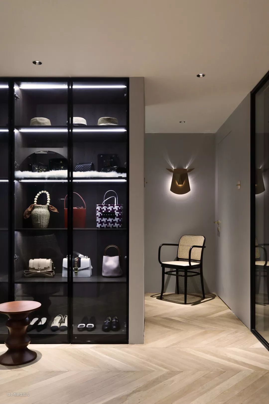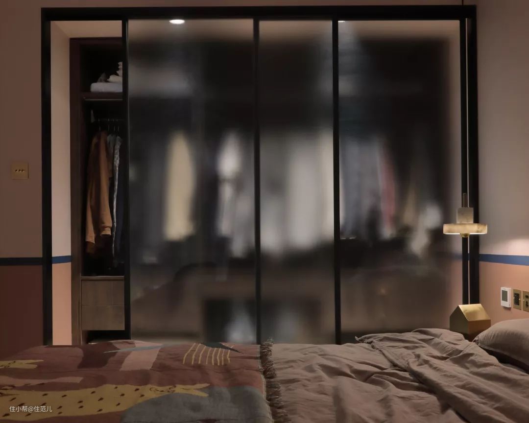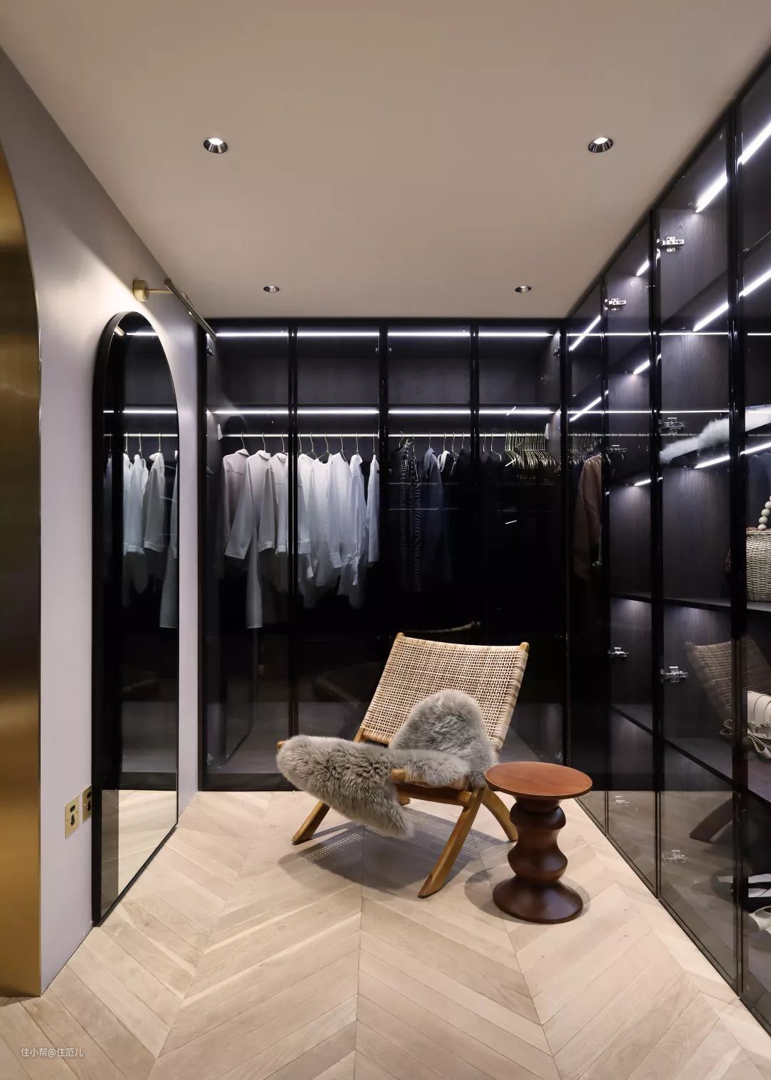 主卧的衣帽间,依旧采用黑色细框玻璃门分隔,保持整体一致。