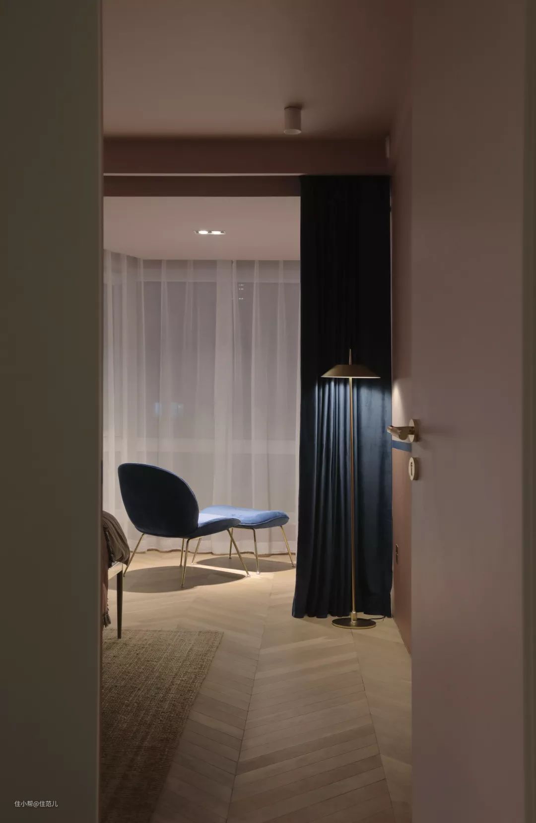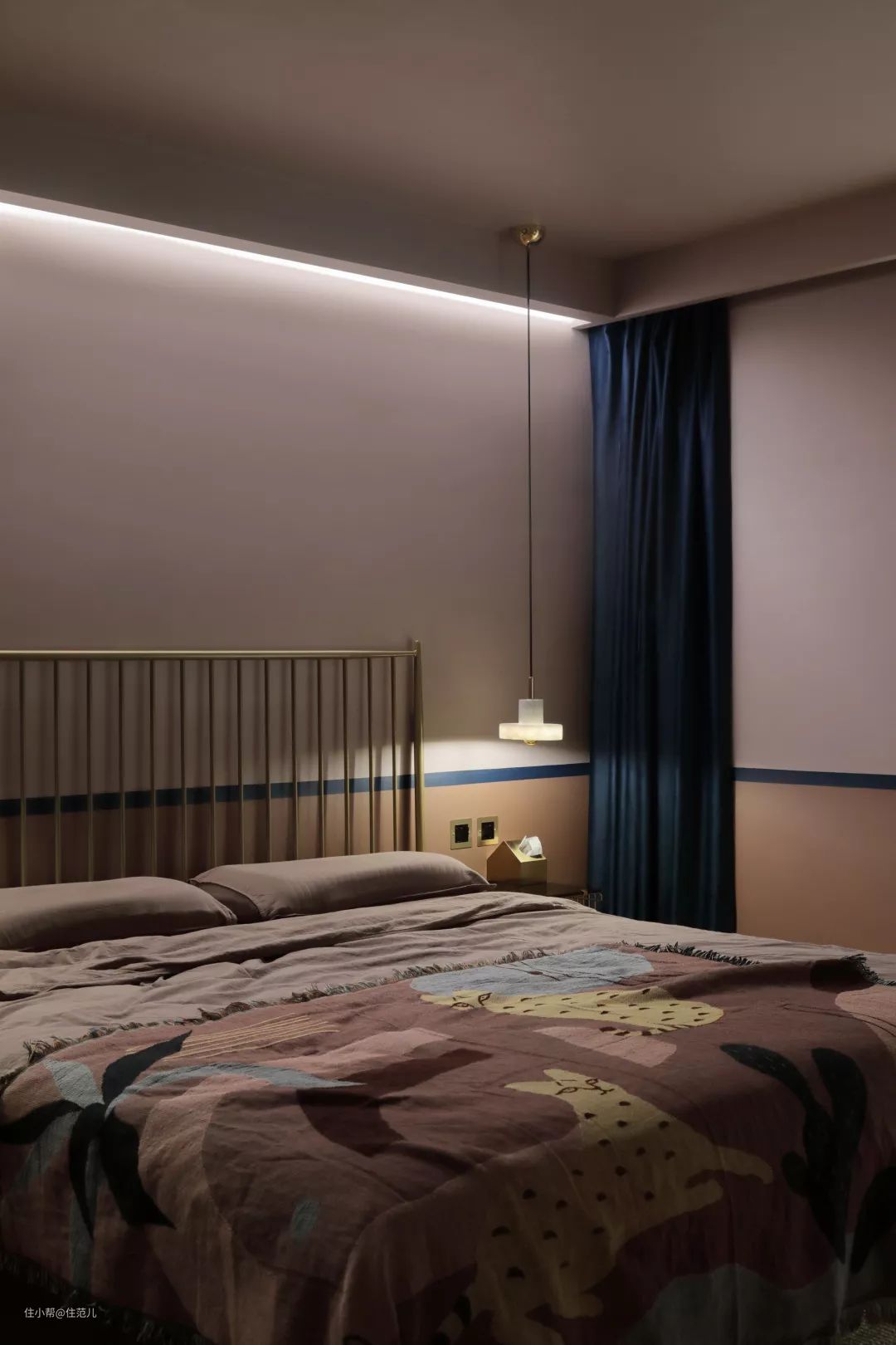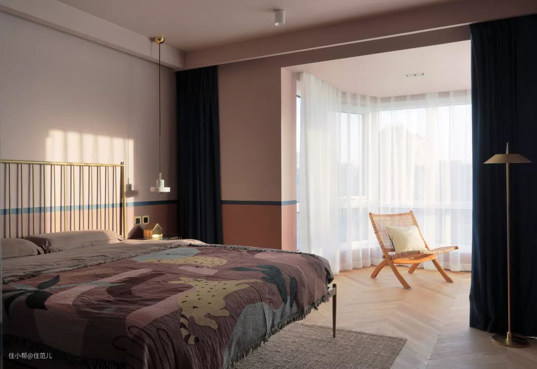 同样是拼色设计,卧室墙面大面积选用了两种灰度高的粉色。