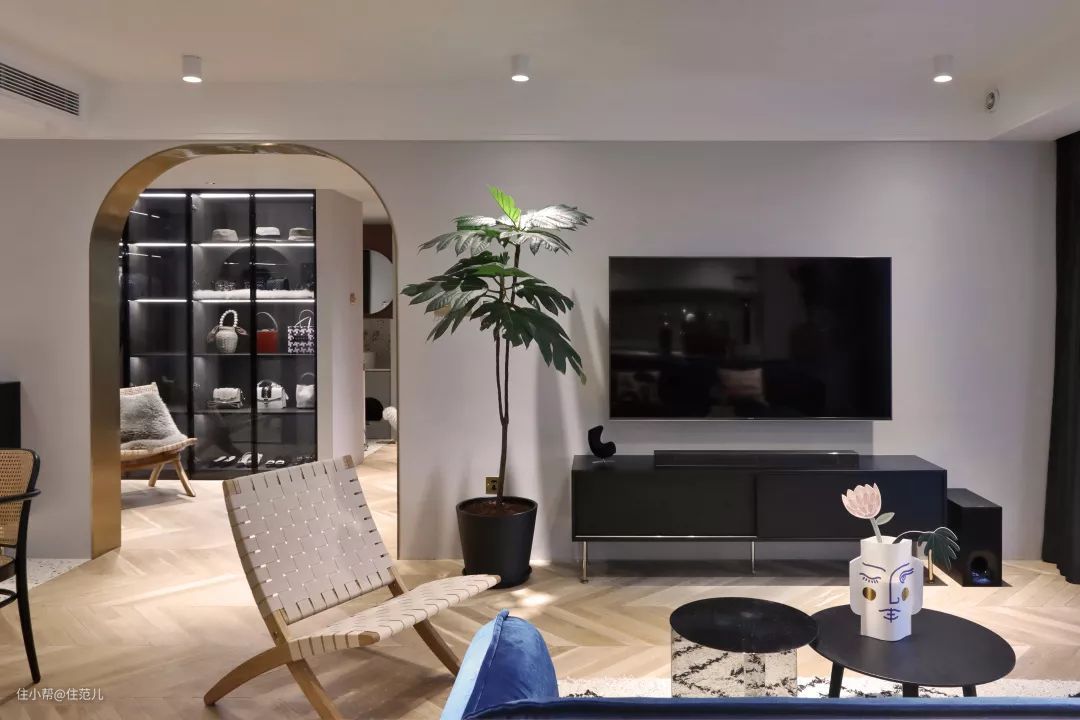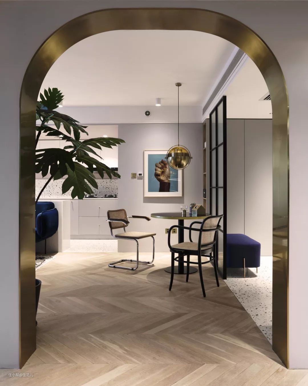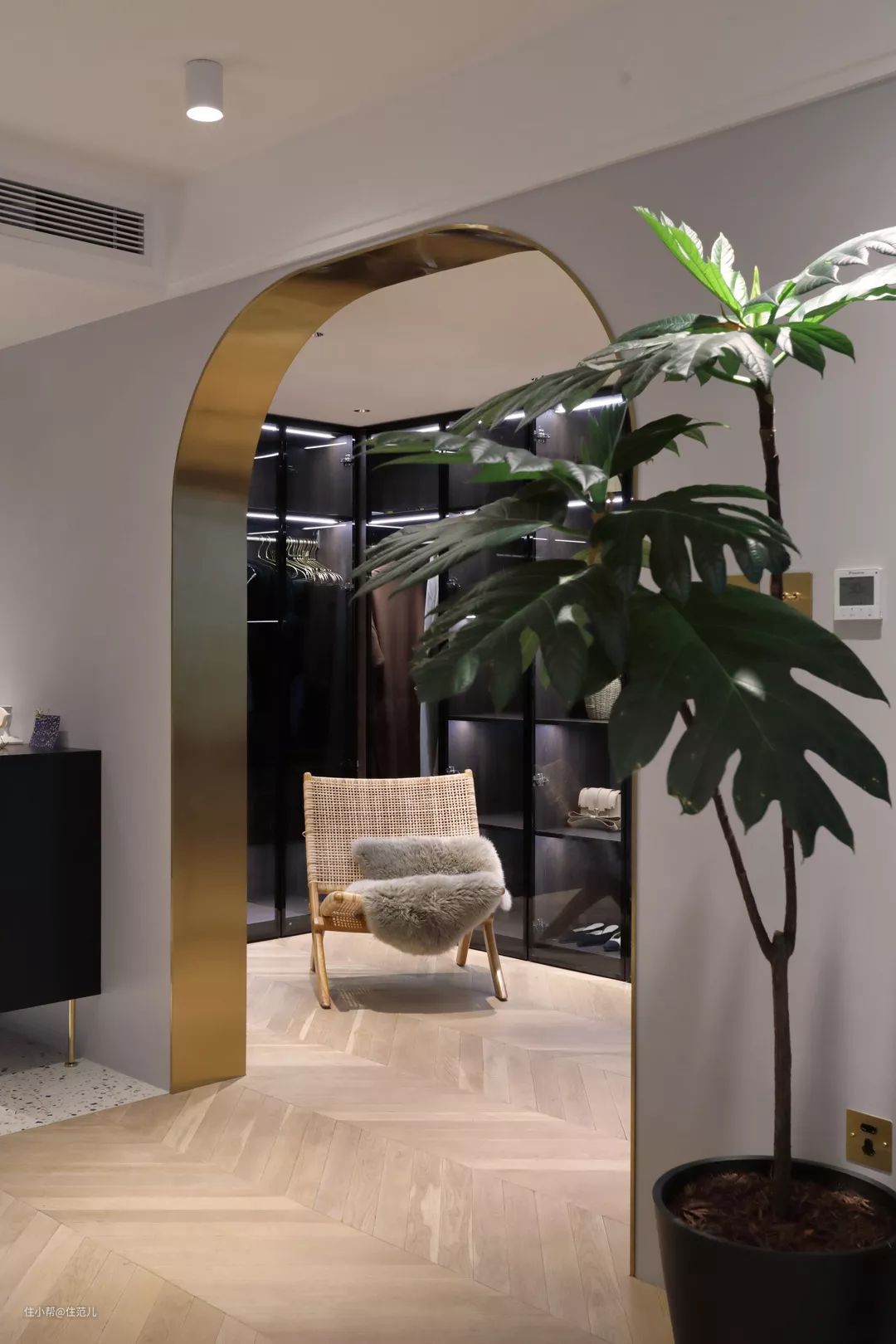 客厅与衣帽间通过拱形门洞分隔,金色门套包边看起来精致奢华。通过垭口贯穿所有公共空间,主卧、卫生间、书房和主衣帽间。走廊布光明亮不显局促,也让整个家都通透了不少。