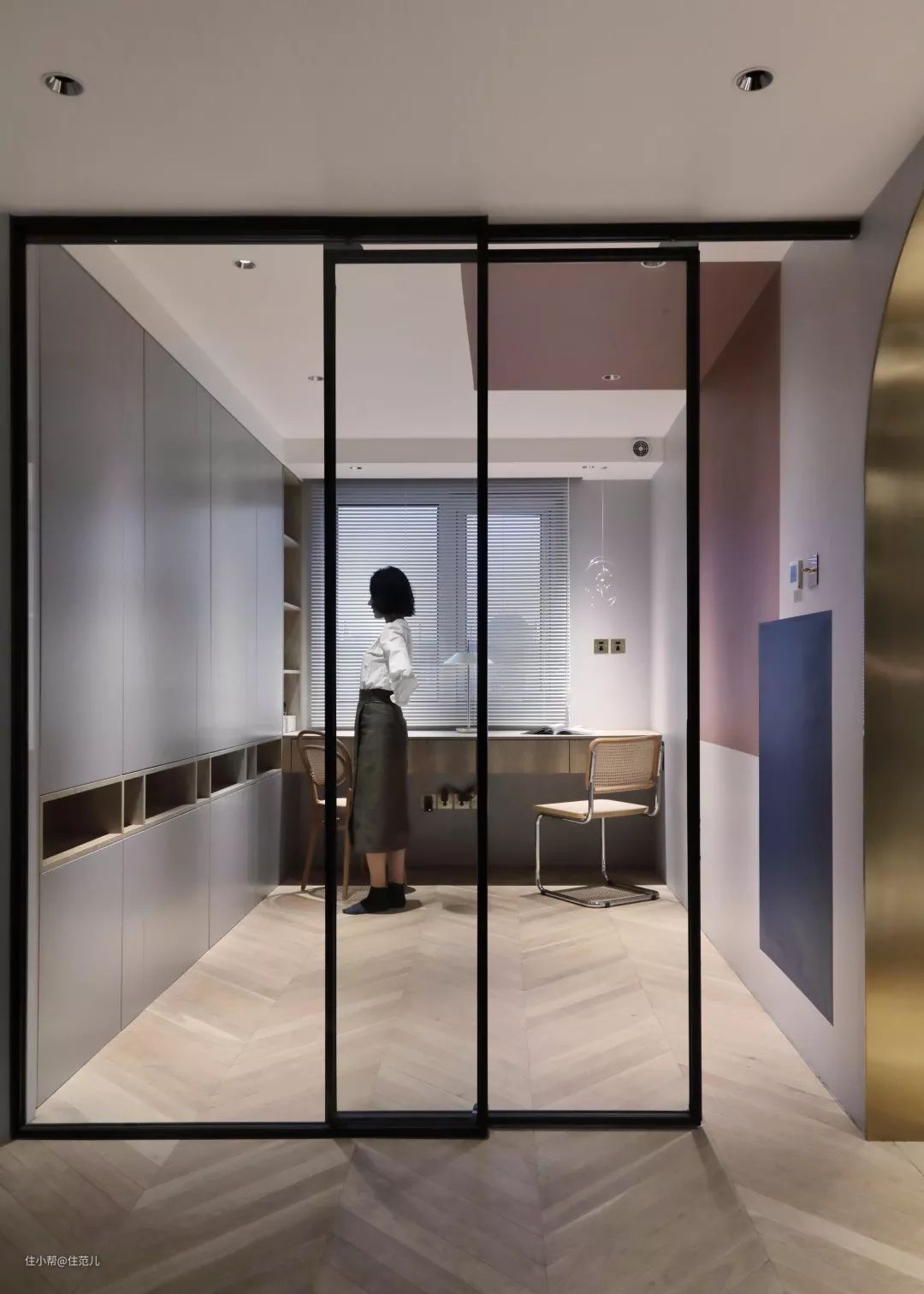 与开放式衣帽间相对的是一间独立书房,采用了整墙的黑色细框玻璃门移门分隔。