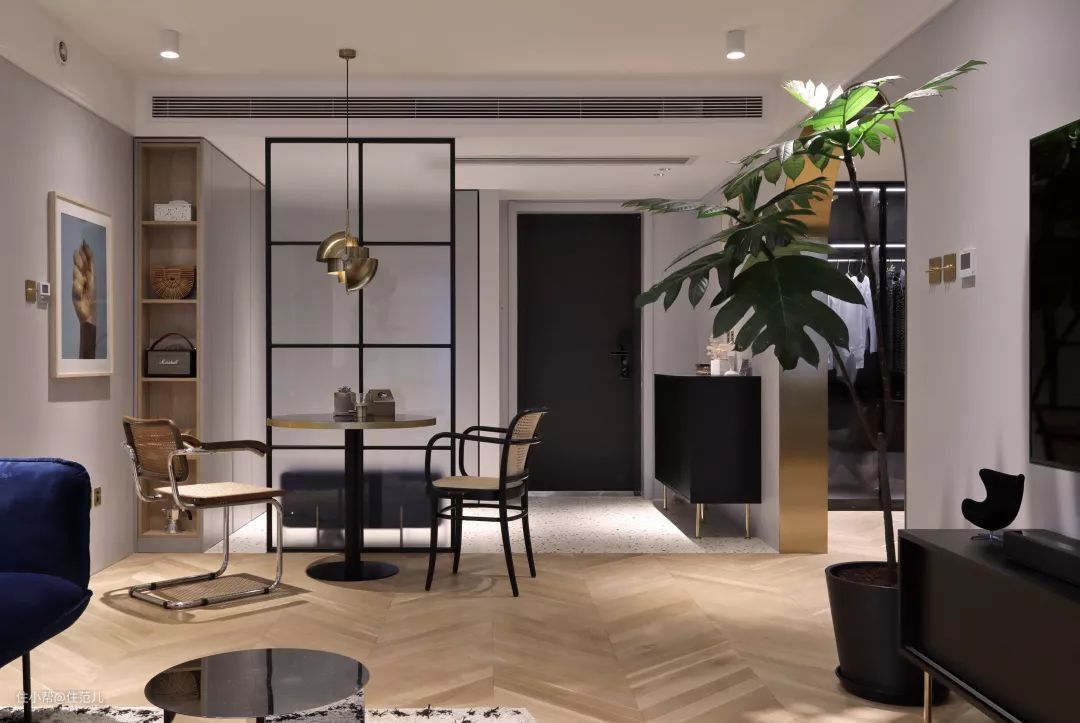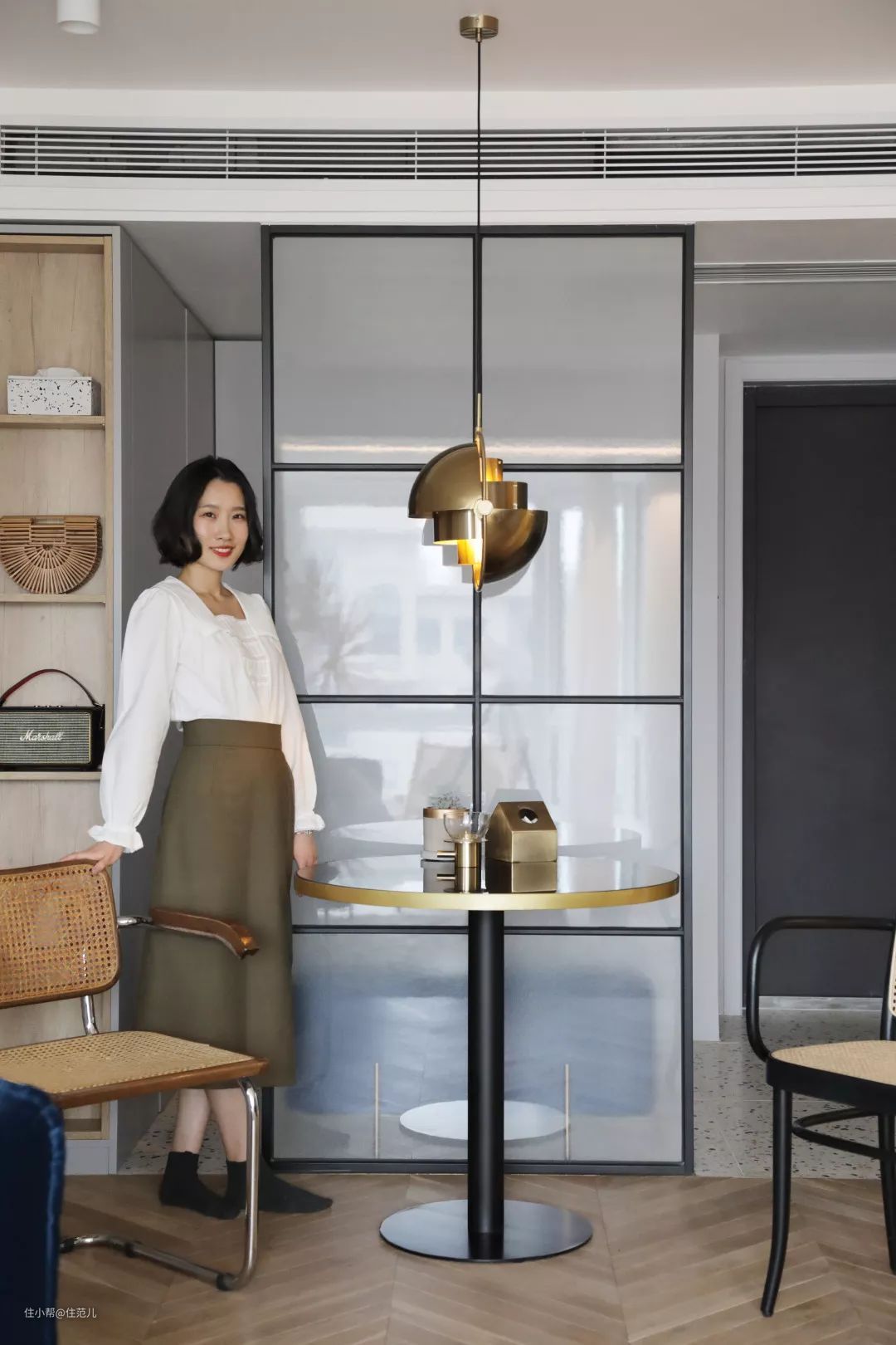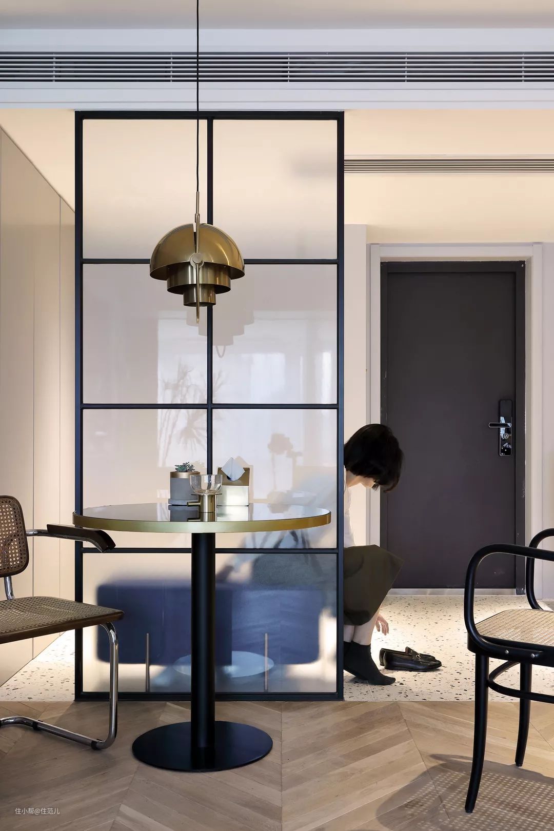 餐厅区域的黑色细框玻璃隔断背景,拍照特别好看。