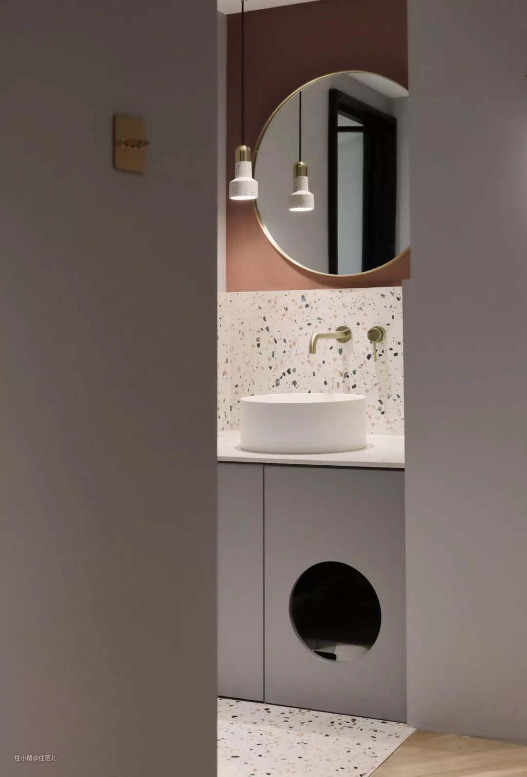 因为家里有猫,所以设计师在浴室柜下面专门开了个洞。