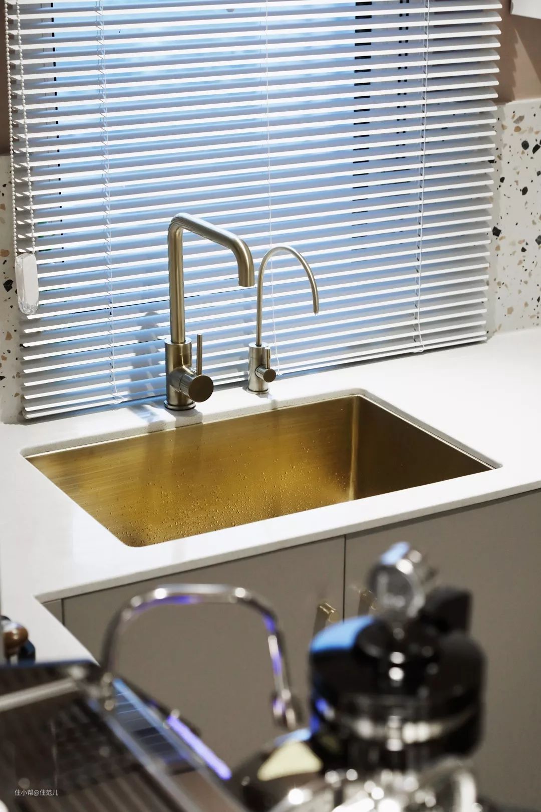 厨房没有按照常规方式做集成吊顶,而是做了防水石膏板吊顶。内嵌筒灯,灯光均匀分散,更温馨舒适。2cm的白色单层台面,看上去不会显得特别厚重。水槽是最方便好用的台下盆设计,不会留卫生死角。黄铜材质水槽和黄铜色水龙头相互呼应。