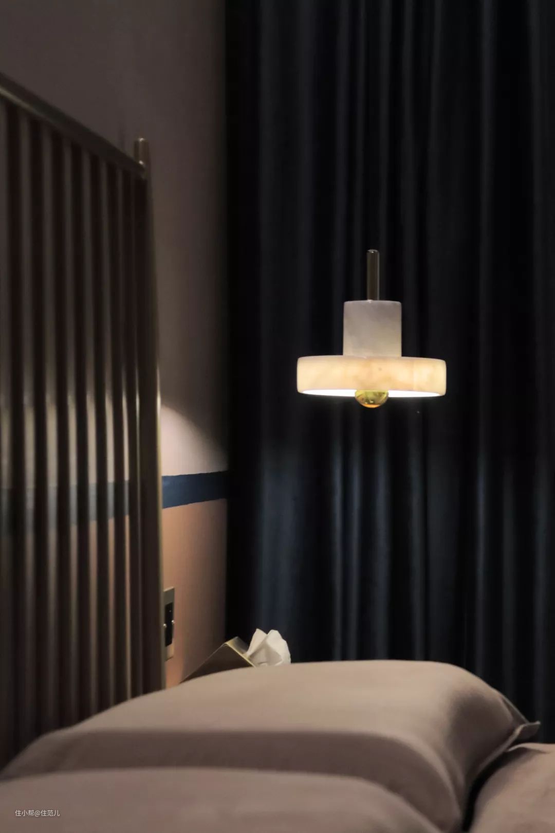 嵌入的点光源筒灯和床尾的金色落地灯,做卧室氛围补充照明,光线柔和适合休憩。