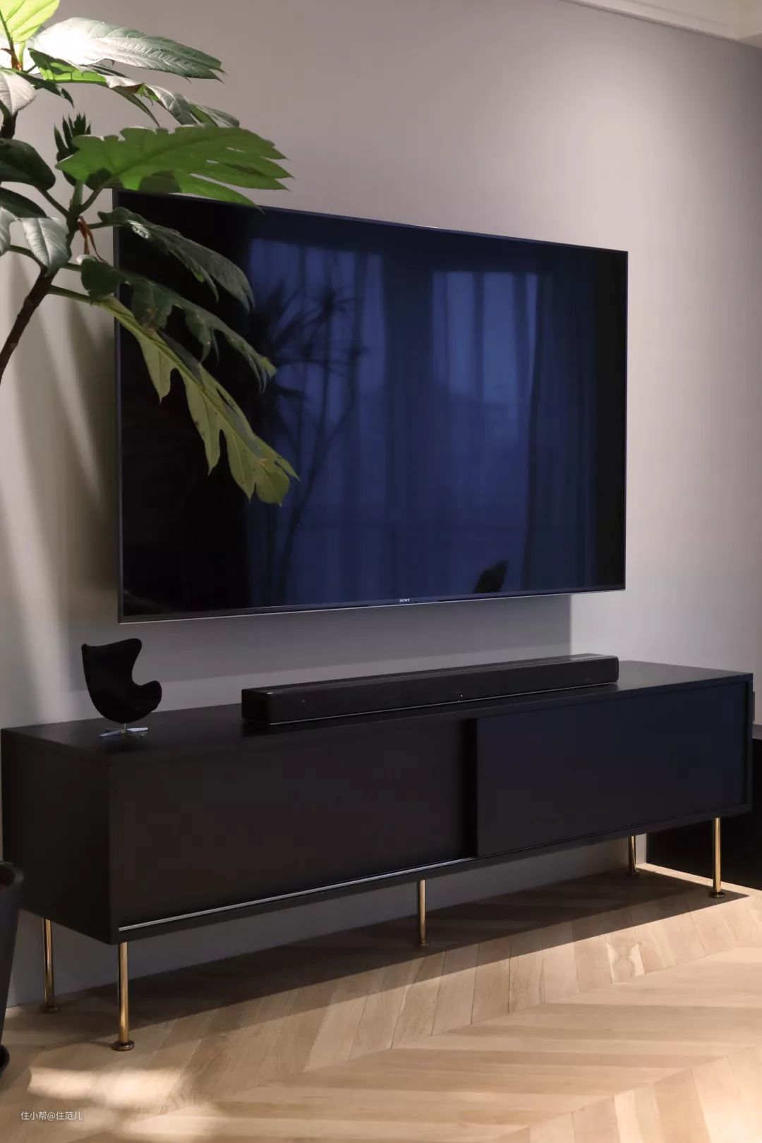 客厅用嵌入式组合筒灯代替主灯,显得空间视觉感更宽阔。屋内摆放一株绿色植物,让整个家都鲜活放松起来。浅灰色系墙面没有过多装饰,电视柜也选择了玄关柜同款,整体和谐统一。为了把电视线全部埋在墙里,设计师特意在电视后面预留了一根5公分的管子。设备则全部藏进了电视柜里,保证干净整洁。