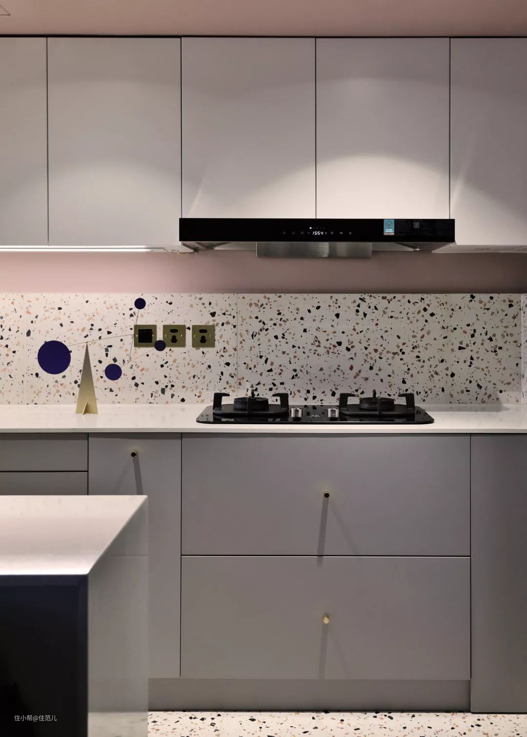 水磨石从地面延伸至厨房墙面容易溅水的地方,粉色防水乳胶墙漆与水磨石拼接。