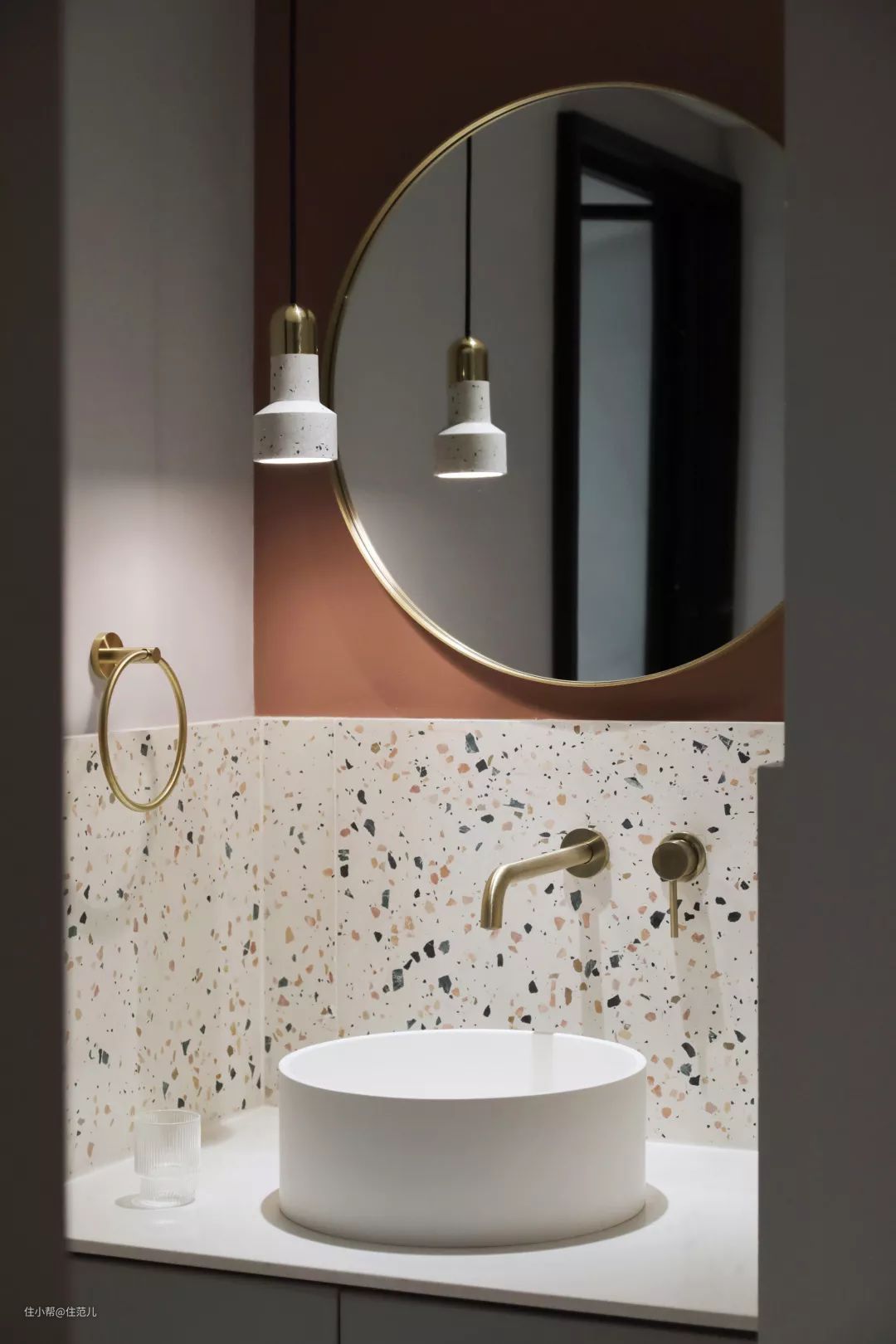 圆形金色浴室镜,搭配脏粉色防水漆墙面,强调着空间的精致感。