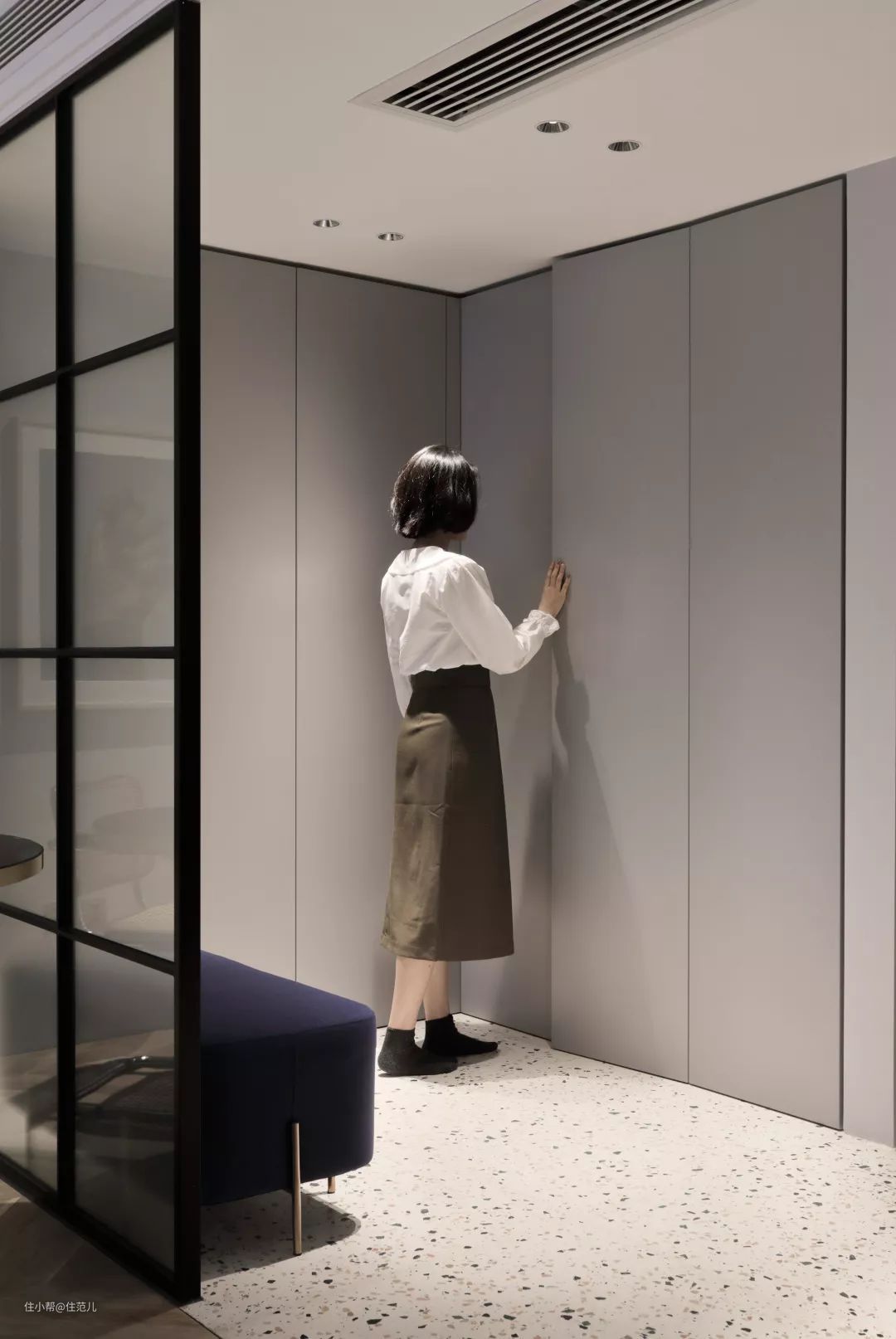 主卧的衣帽间,依旧采用黑色细框玻璃门分隔,保持整体一致。