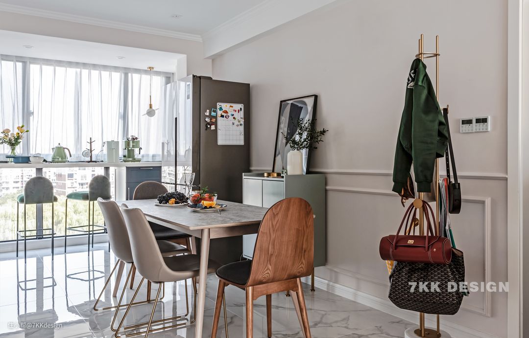 进门处落地衣架上面摆放的主人的包包衣物,也成了画面的一道亮丽的风景线。餐桌上精致的水果摆盘充满着满满的生活仪式感。