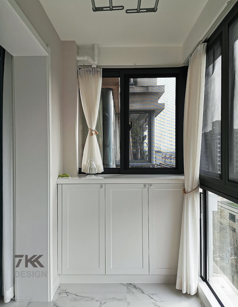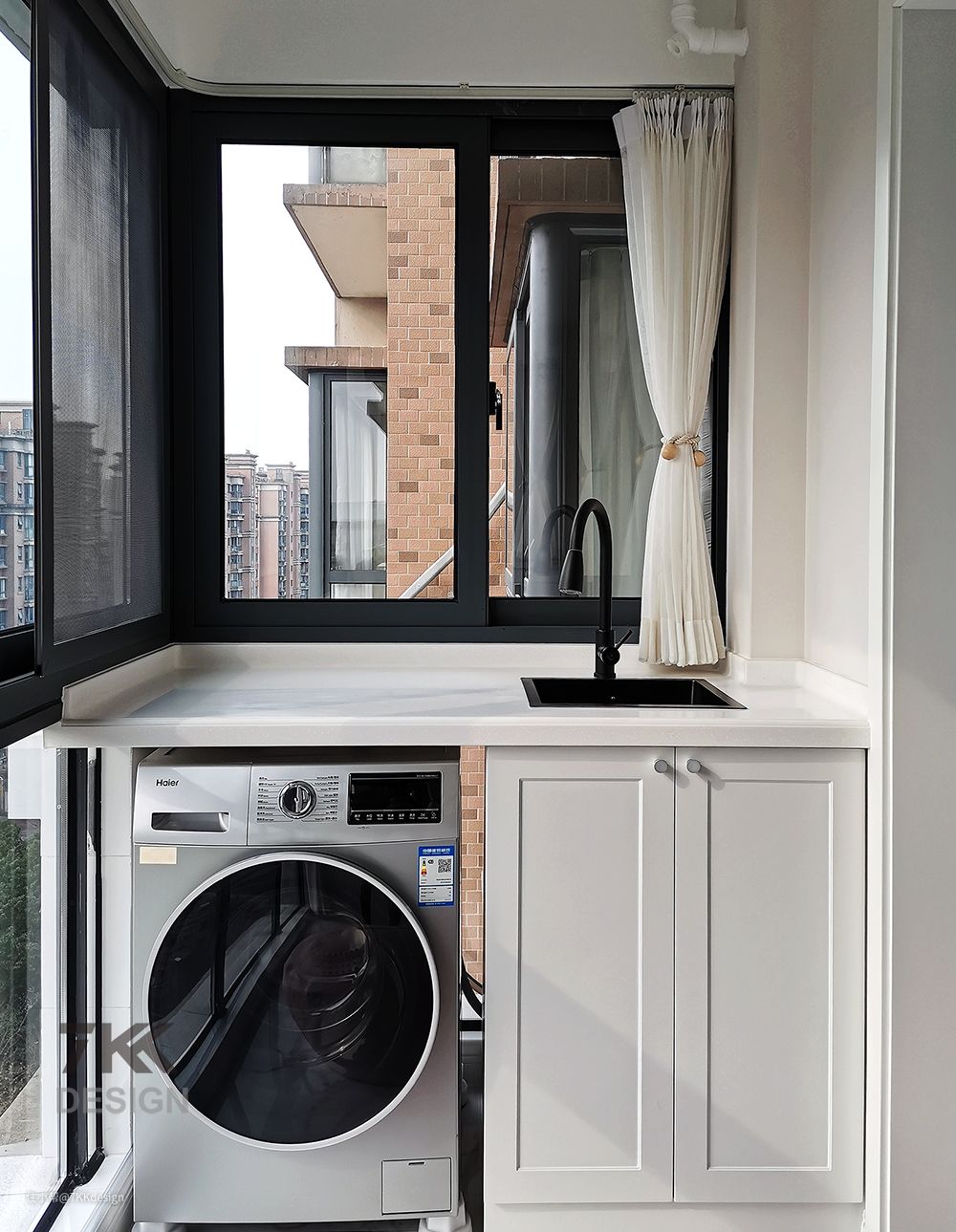 2、南阳台主要作为生活阳台,一侧定制的矮的收纳柜,另一侧是定制的水槽+洗衣机。