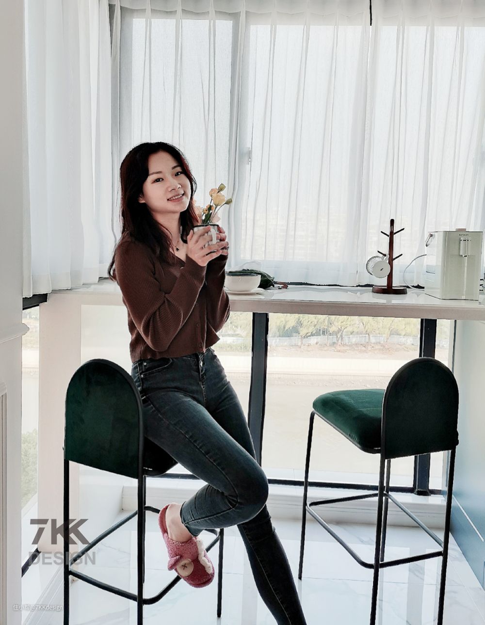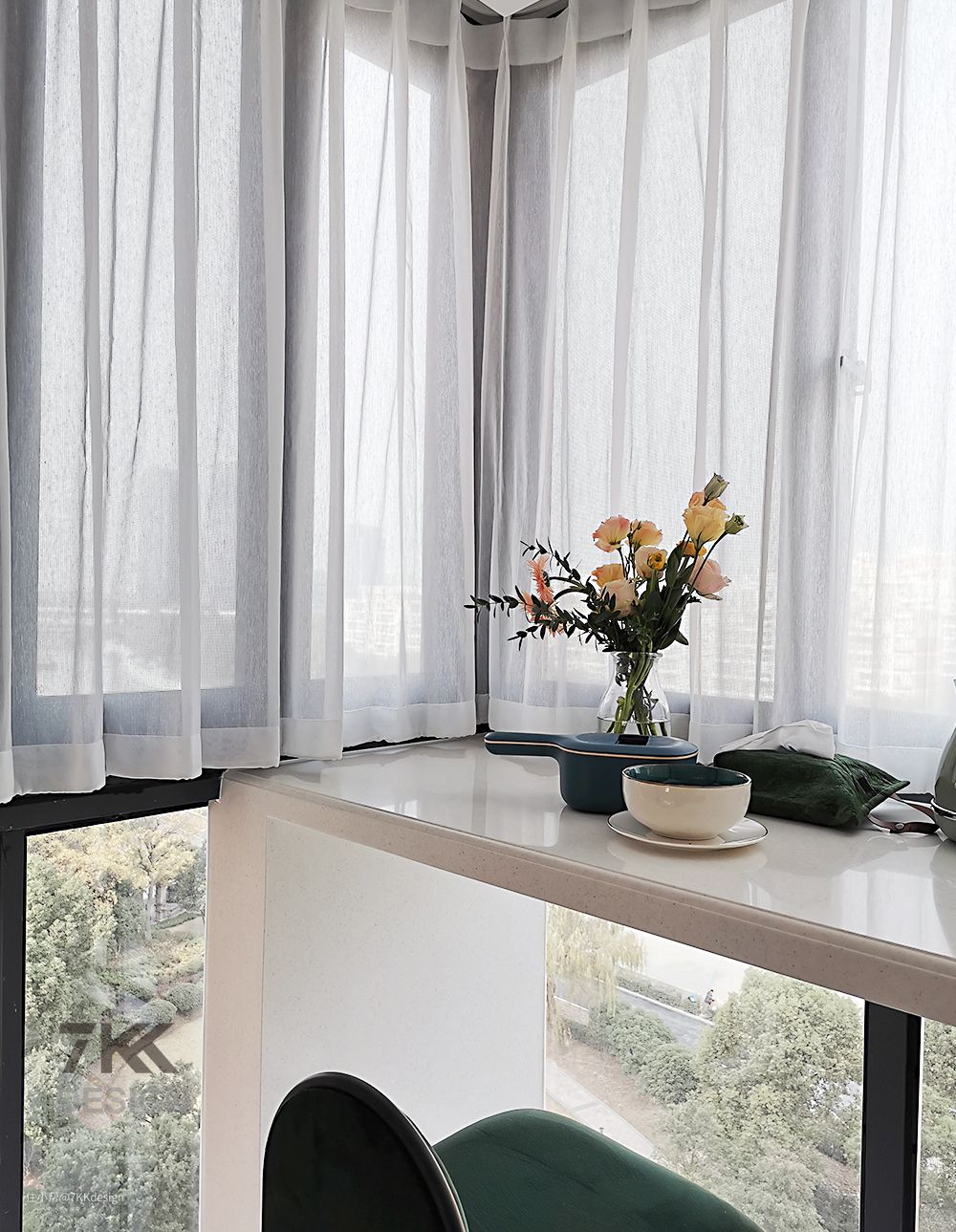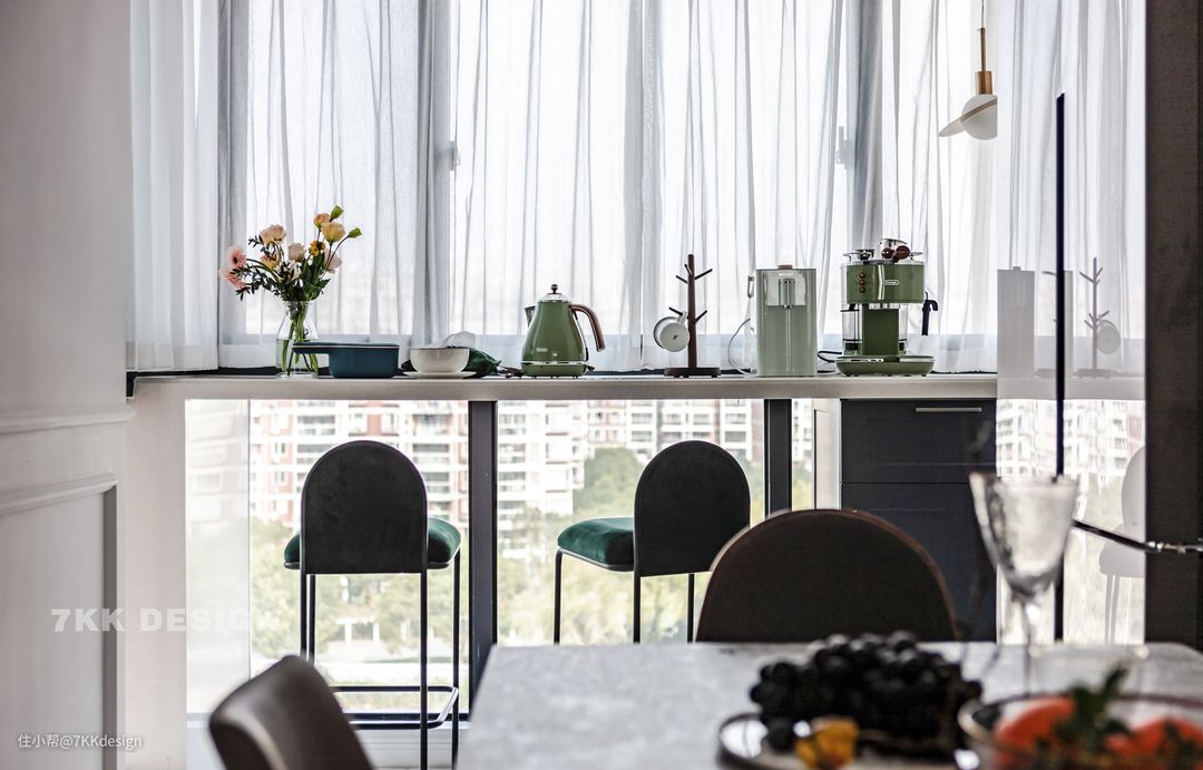 北阳台定制的吧台,标配的高脚凳,墨绿色更显优雅时尚。拉开窗纱透过大面积的落地窗可以看到外面美丽的风景。吧台上方摆放精致的装饰摆件+小家电。