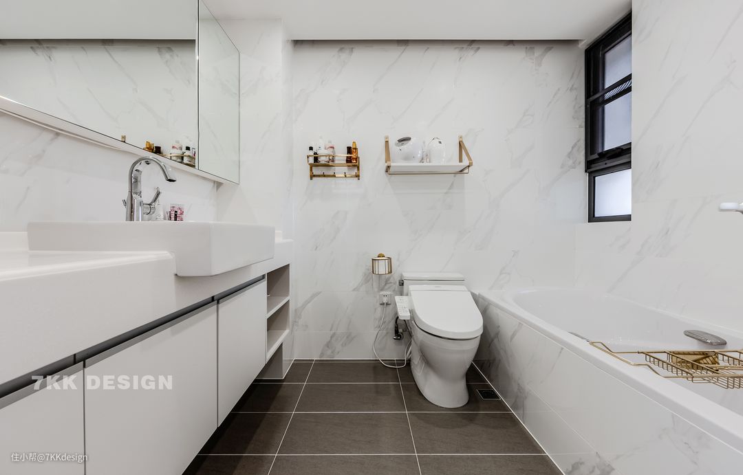 主卧卫生间,业主比较喜欢明亮的感觉,墙面+洗手台面+浴缸都是以白色为主,深灰色方形地砖拼接,干净清爽。打开镜柜里面暗藏更多的收纳功能哦。