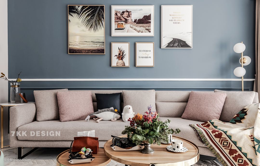 沙发选择2.7m长可坐3-4人,墙面选用暖色调的挂画作为装饰,错落的圆形茶几上面摆放的插花,收纳盒,咖啡杯,诉说着业主生活的点点滴滴,精致而有品位。