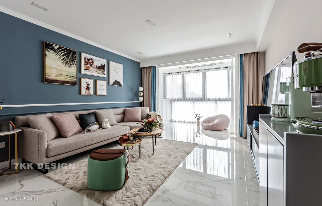 在选择地面材质的时候业主是比较纠结的,一开始设计师建议用木地板家居会更温馨舒适些,但是男业主比较偏向瓷砖,打理起来会比较方便,最终设计师在满足业主选用瓷砖的情况下,选用地毯搭配调和冷色调,增加层次感。