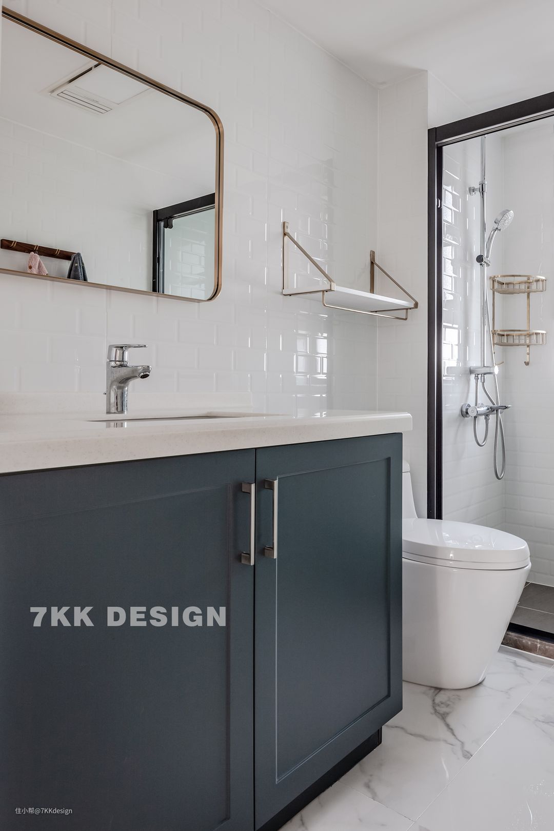 次卫L型,台盆柜+马桶+淋浴房。也是白色为主,镜框+装饰架金属元素点缀,营造精致清爽的卫生环境。