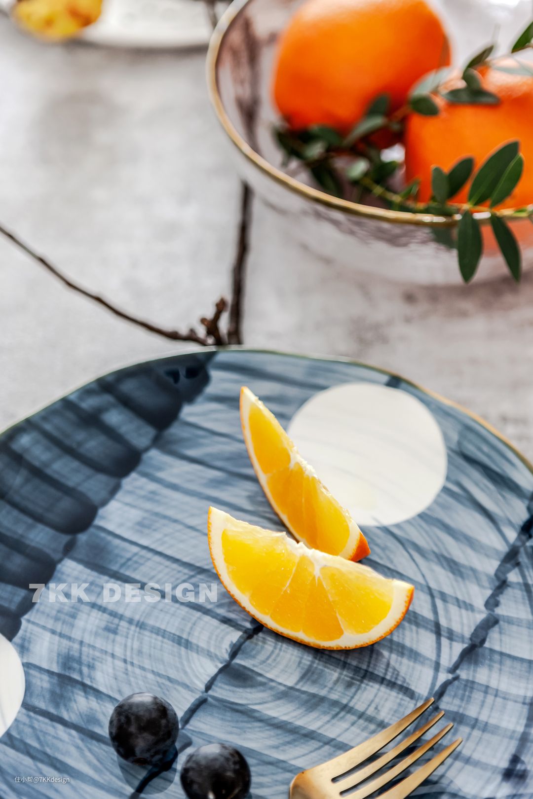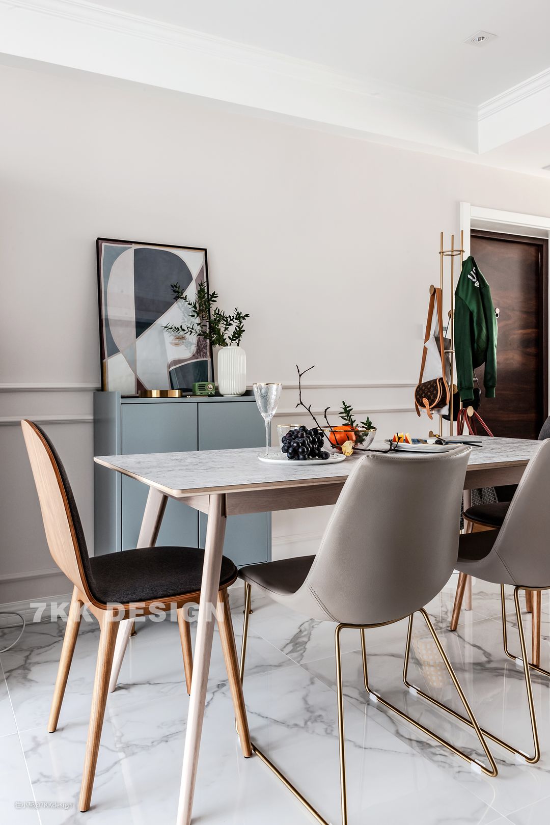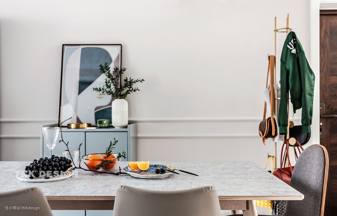 进门处落地衣架上面摆放的主人的包包衣物,也成了画面的一道亮丽的风景线。餐桌上精致的水果摆盘充满着满满的生活仪式感。