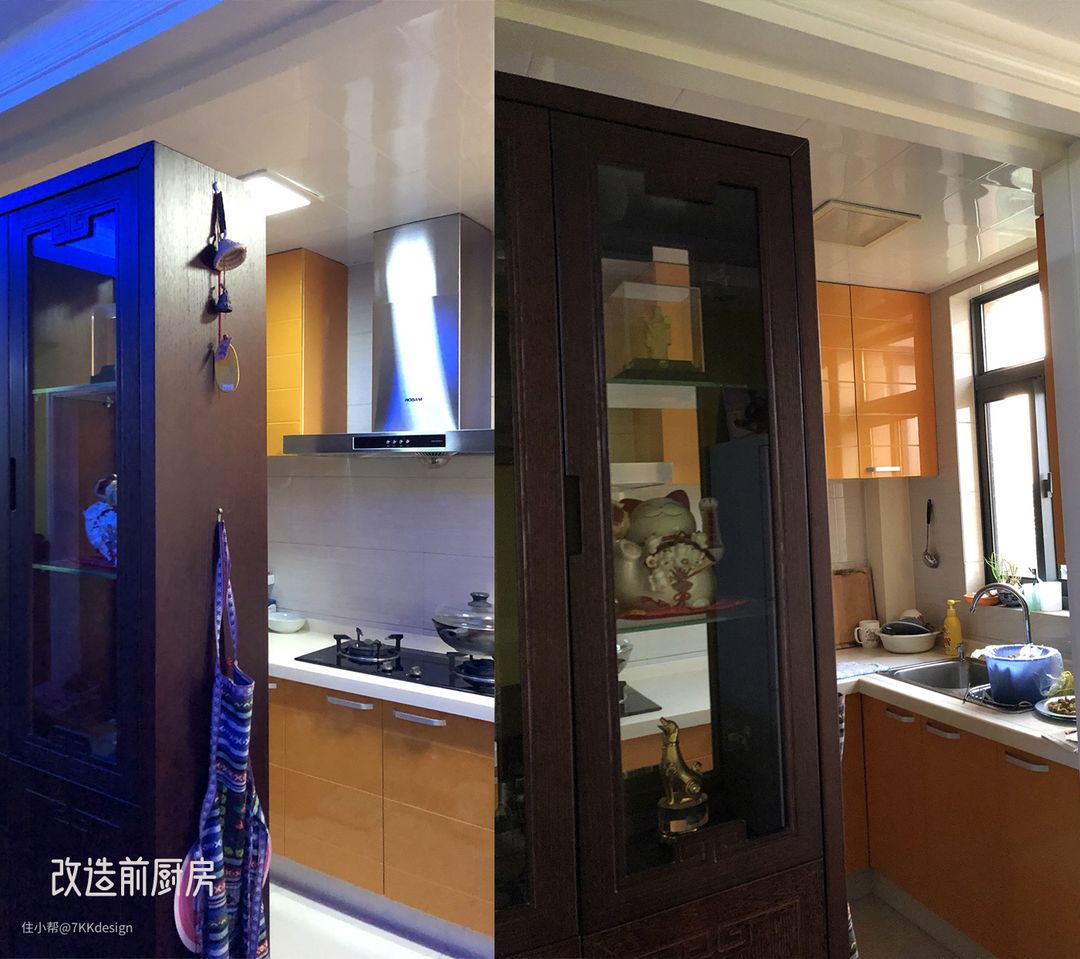 改造前厨房和餐厅中间用颜色深重的柜体隔断,空间压抑,不够通透明亮。