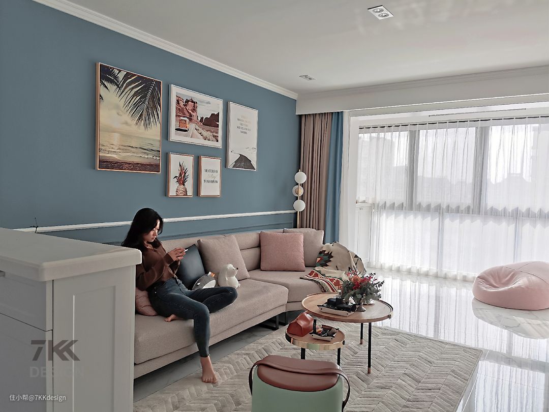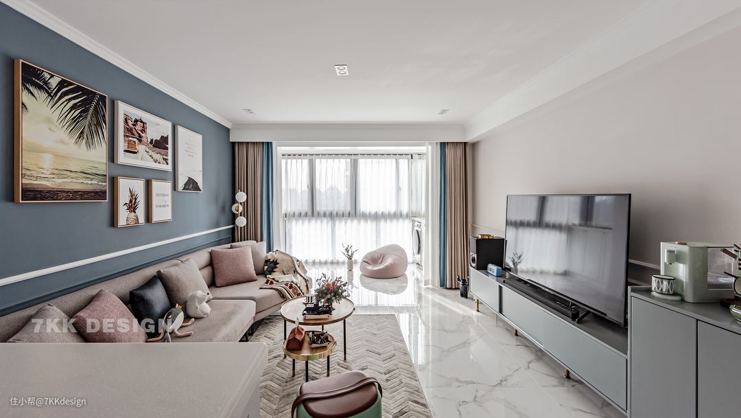 在选择地面材质的时候业主是比较纠结的,一开始设计师建议用木地板家居会更温馨舒适些,但是男业主比较偏向瓷砖,打理起来会比较方便,最终设计师在满足业主选用瓷砖的情况下,选用地毯搭配调和冷色调,增加层次感。