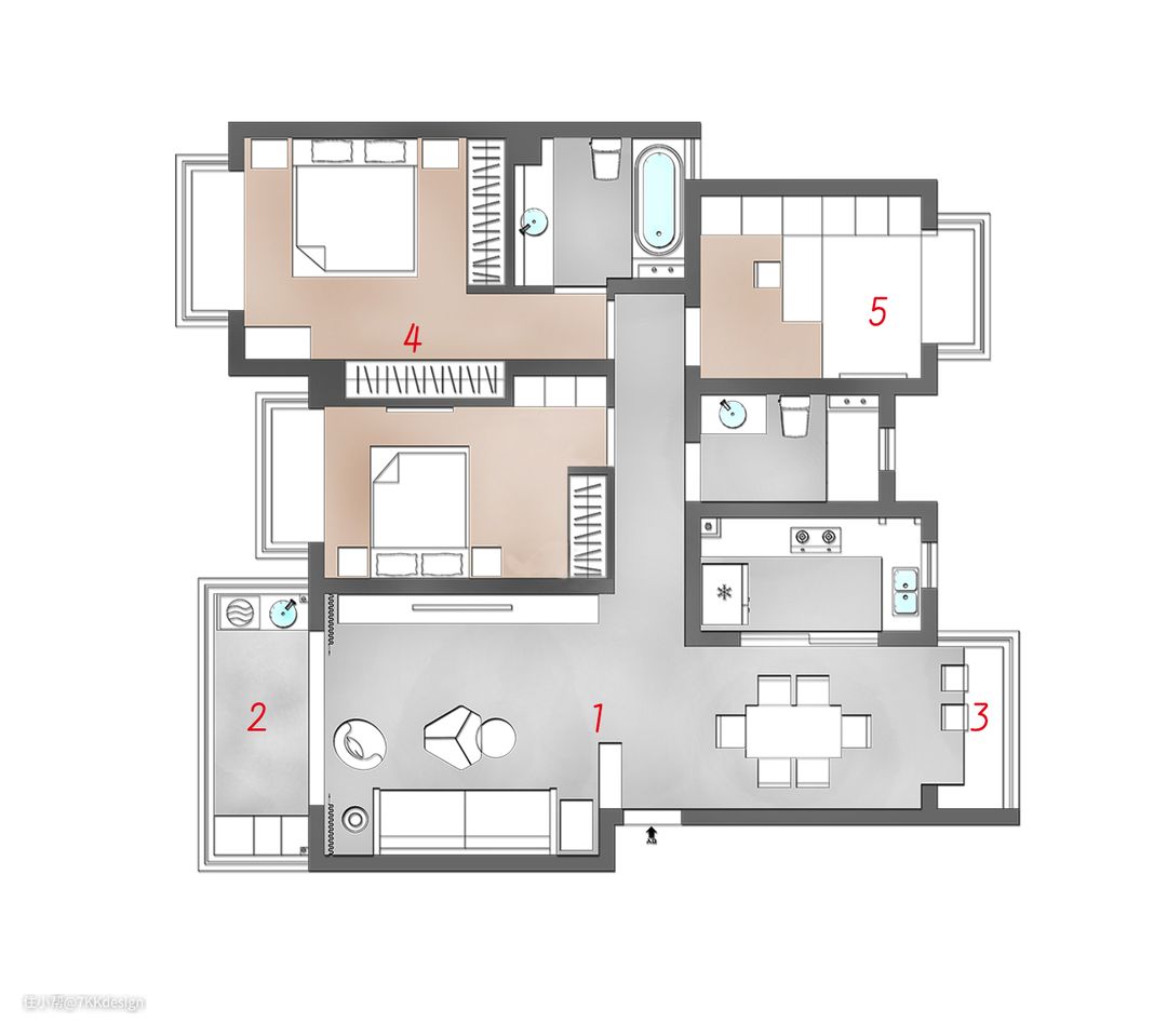 4、主卧为了更多的收纳需求,借助次卧部分面积增加一排衣柜。