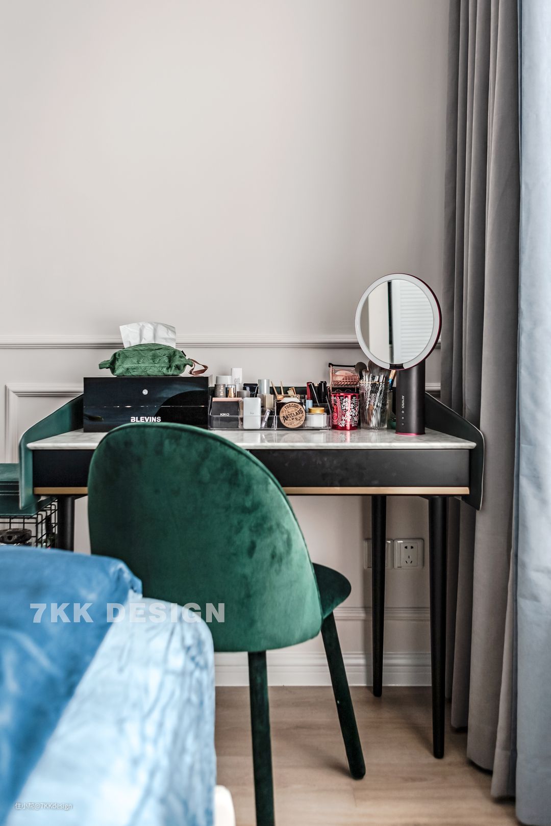 床尾靠墙角一张简单的化妆桌,上面有秩序的摆满了女主人的化妆品,每天最精致的装扮从这里开始。墨绿色的靠背椅子给长时间化妆带来更多的舒适感。