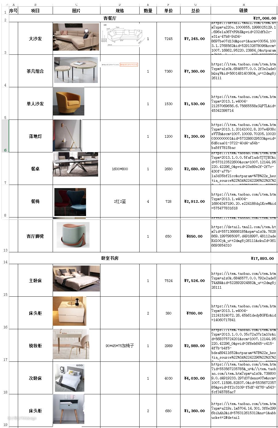 软装清单:部分软装装饰品设计师网上链接形式发给客户选择,部分大的活动家具设计师陪同客户家具店采购。