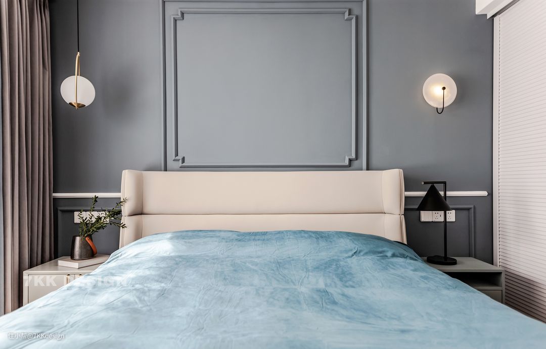 业主真的是比较喜欢蓝色的,床品选择蓝色的搭配+床头柜一抹绿色点缀,营造静谧的睡眠空间。