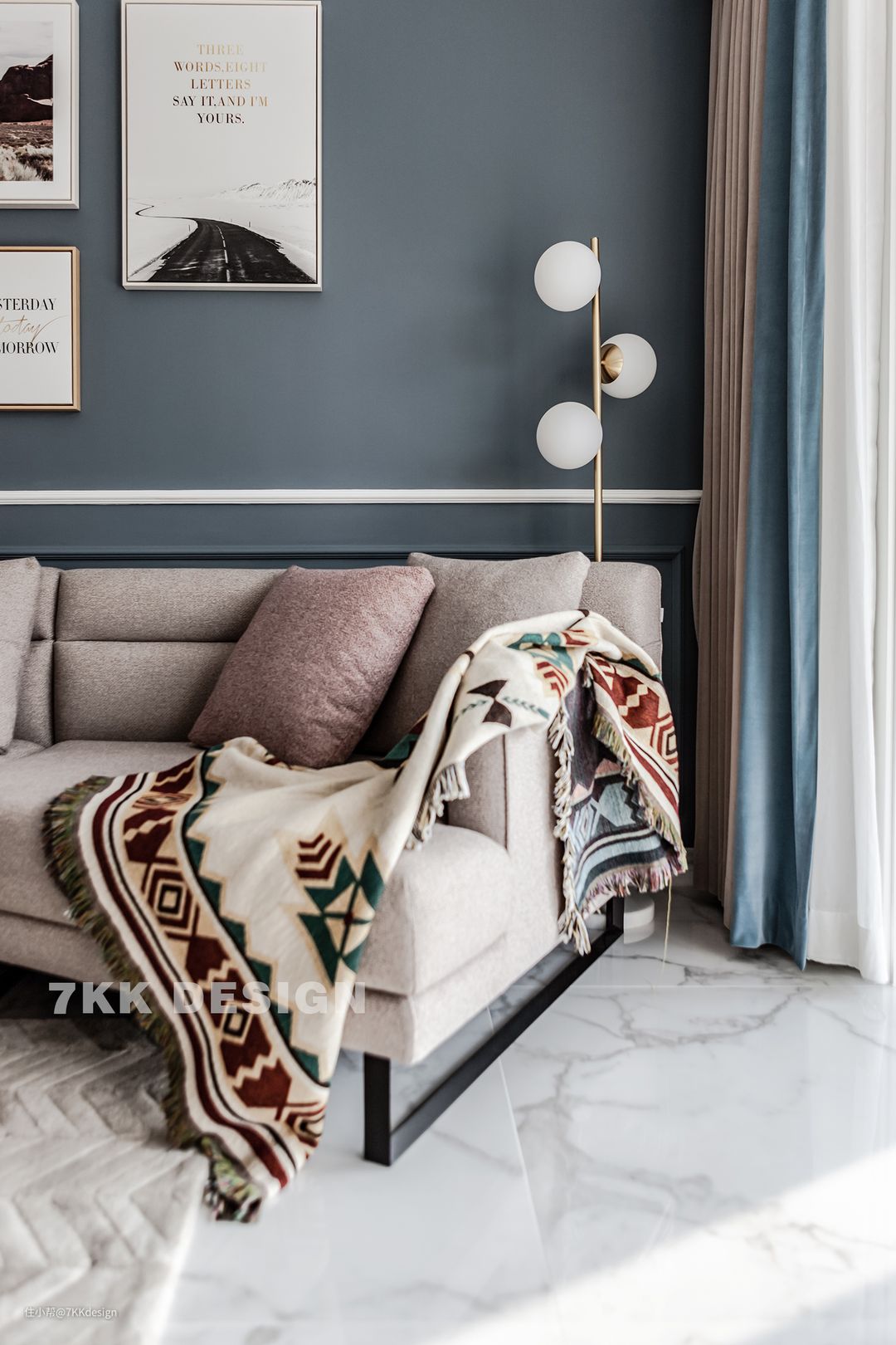 沙发一角简易金属落地灯搭配,弥补光源的不足,增加层次感和生活仪式感。