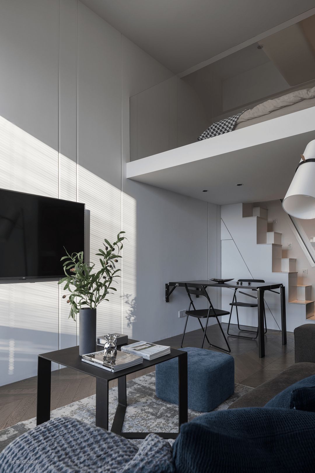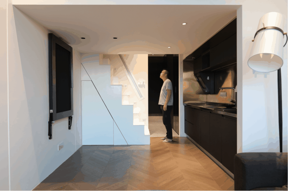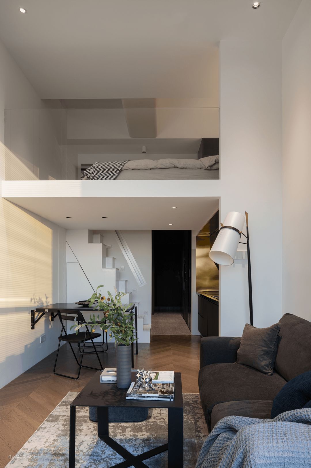 通过楼梯我们就可以到达二楼#楼梯 #嵌入式扶手 在较短距离设计楼梯非常难搞,旋转楼梯尺寸不够,正常阶梯长度不够,反反复复测试,采用高低错落楼梯方式,可以一步变二踏,非常方便使用。同时有踏步感应灯,