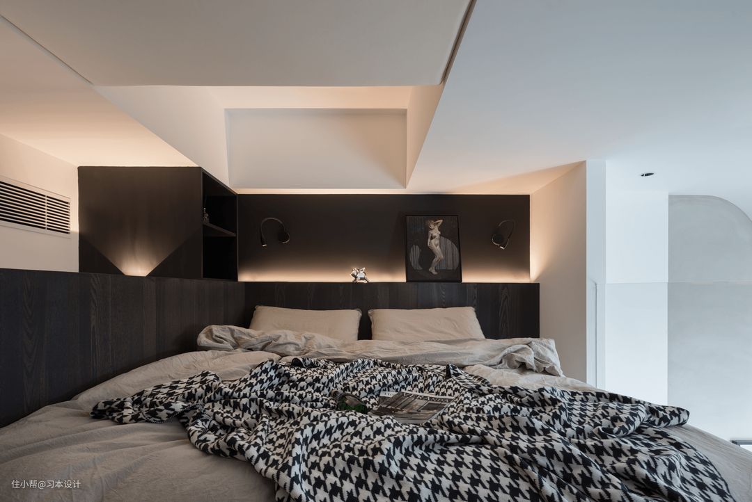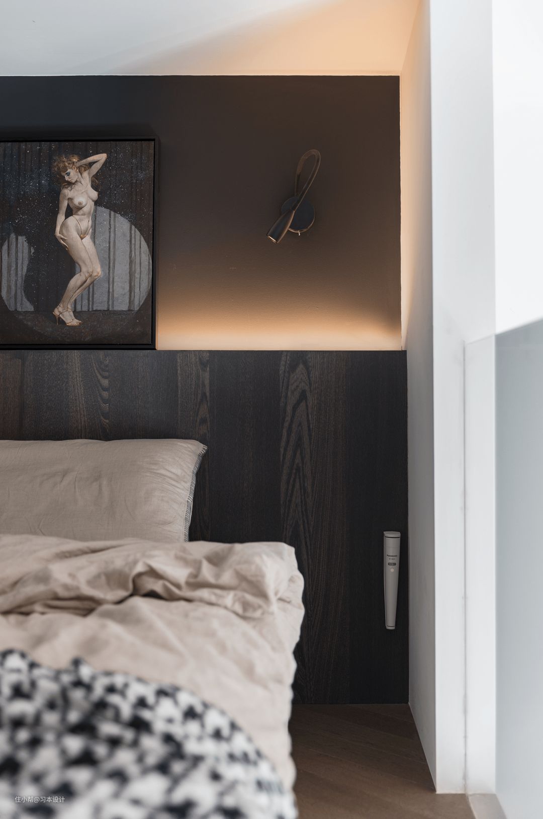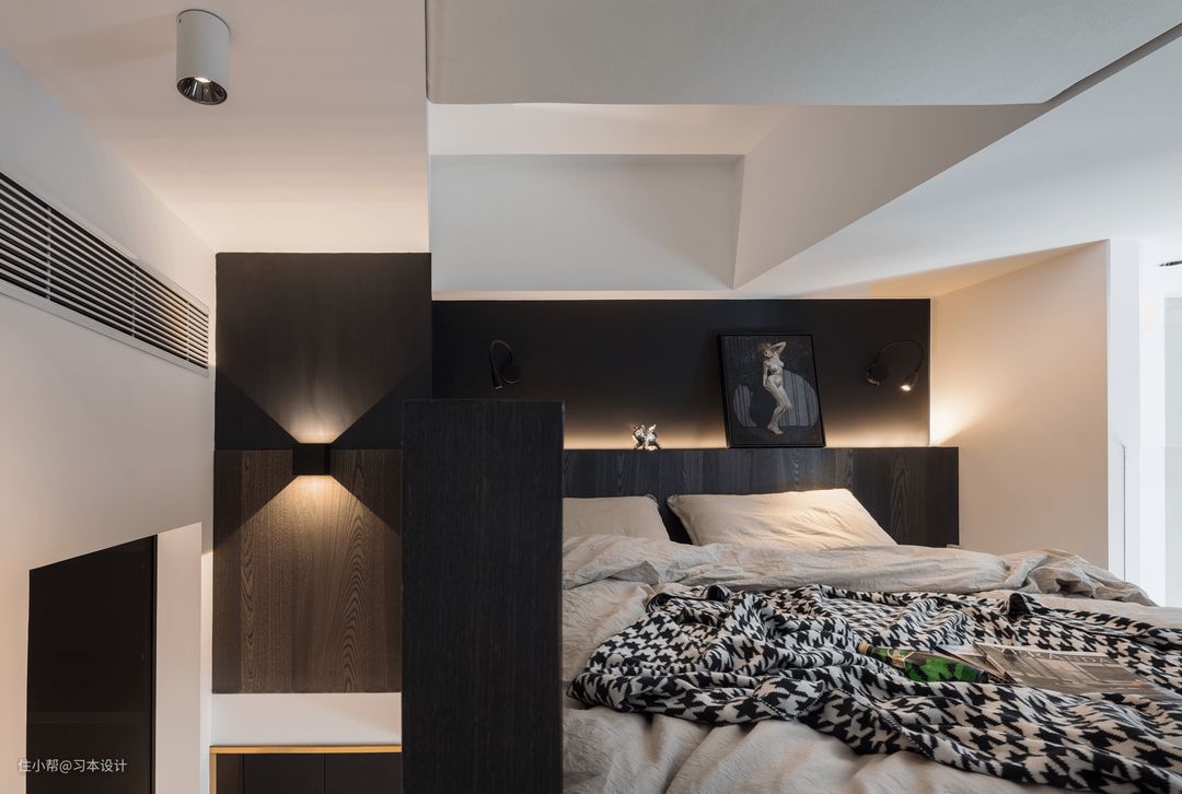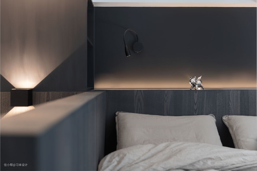 楼梯口看主卧床头的视角,黑色乳胶漆并没有感觉到压抑,反而通过光带的承托下,更显温柔。壁灯上下光影效果点缀了整个空间