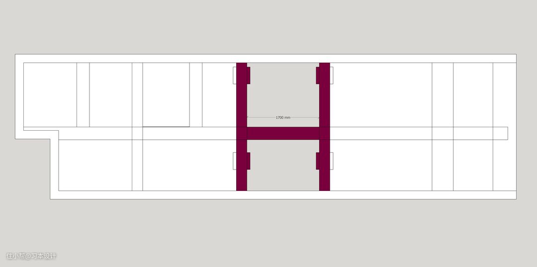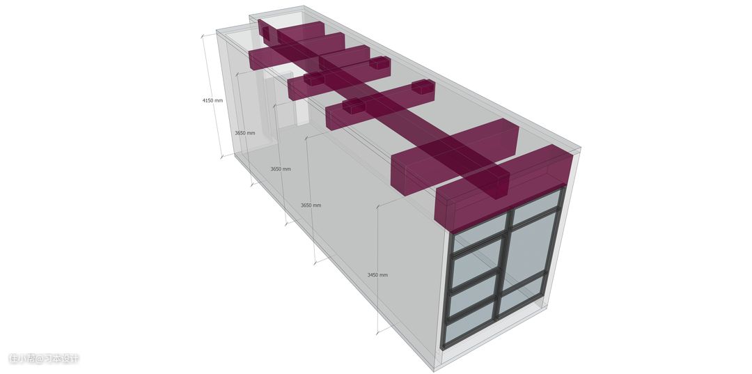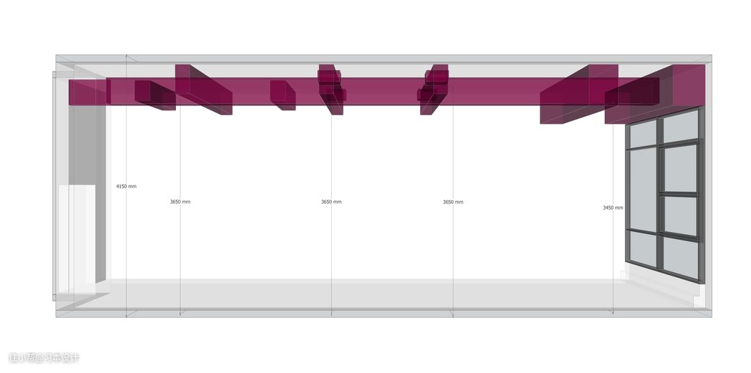 如何完成挑高空间呢? 我一直很头疼如何在3.7m下做二层,但是业主首要要求就是要挑高,思考很久始终没有太好的方式。 通过不断建模实验, 我们寻找了最佳方式处理, 4150mm可以做挑高, 那么就寻找最合适的4150mm最佳位置, ①入门部分梁比较乱,不适合。 ②靠窗更不适合,因为会影响光线。 那恰巧中间部分给了, 一个绝处逢生的1.7米较为宽的尺寸。 这个黄金的1.7米下,层高4150mm除去楼板层/铺贴高度,这个地方下方保留2m,二楼最高可以做到1.9m 。