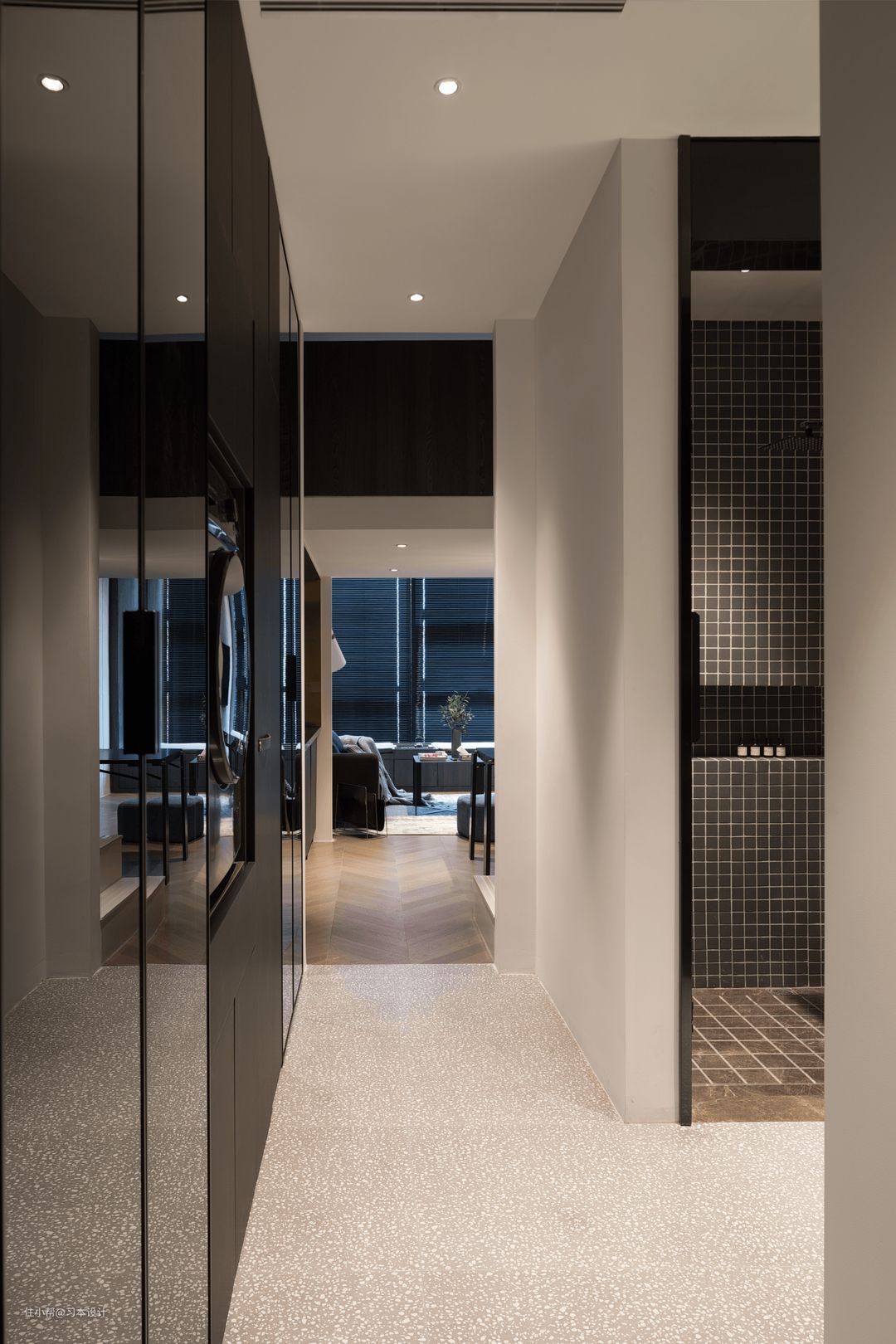通过玄关的视角干净利落,淋浴房采用马赛克墙砖,再较小的空间,利用小规格砖铺贴也可以达到较为舒适的视觉体验。集成衣柜上面的洗衣机也进行了抬高处理,滚筒洗衣机最大缺点就是较为矮,需要蹲下来才能方便拿取,而通过设计我们可以更好的把洗衣机抬高,在站立的时候就能完成所有拿/放衣服的动作。#无踢脚线