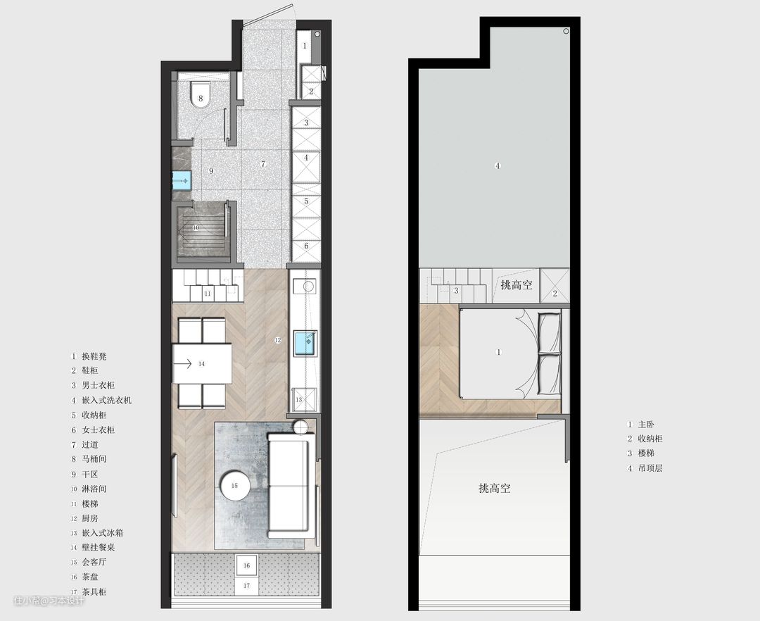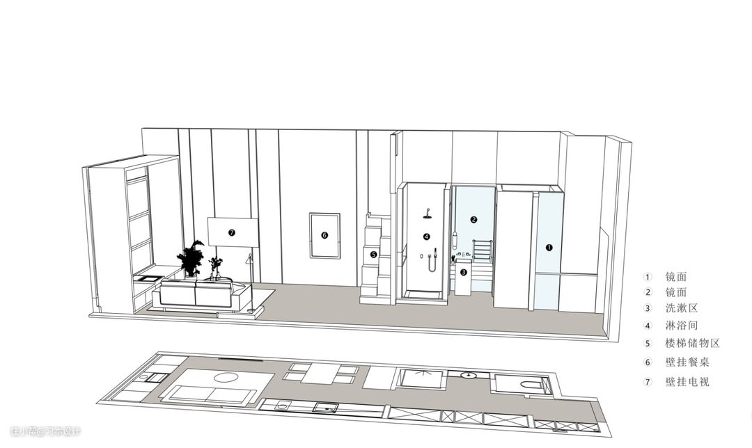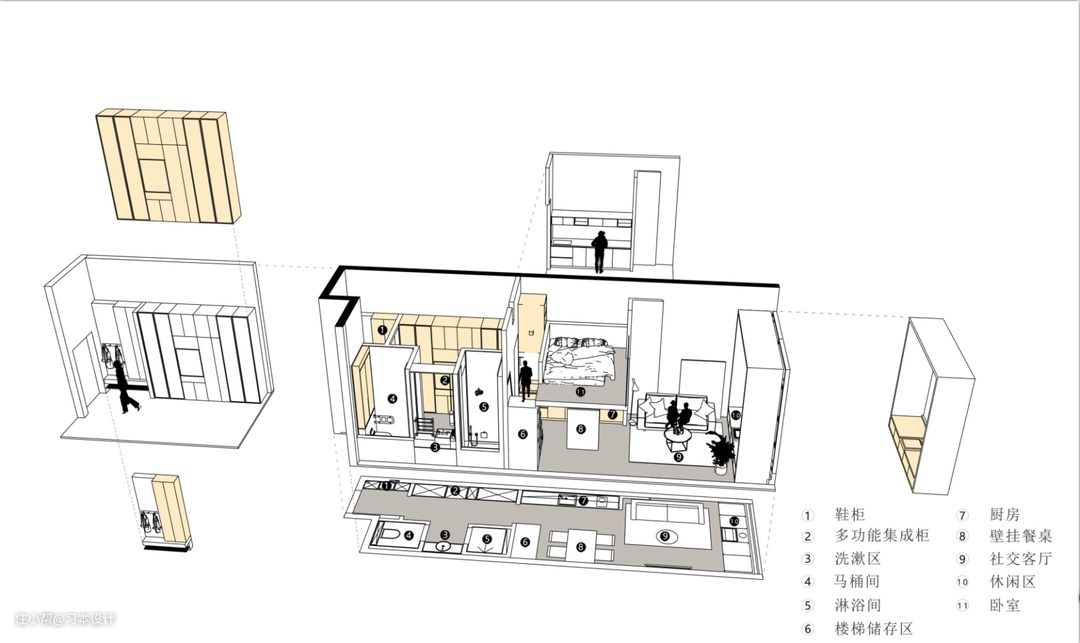 这是一张平面布置图 这套户型整体长度11米,宽度3米,我用了最简单的方式进行了五个方面的划分。 ①:玄关区1.4米 满足进门的坐/鞋柜收纳/全身镜/临时物品放置/挂衣/ ②:生活综合区3.1米 独立马桶间/独立洗漱区/独立淋浴房/男女独立衣柜/洗衣机/楼梯/ ③:餐厅厨房区 厨房餐厅不仅满足烹饪就餐,同时折叠壁挂餐桌收起来,也可以达到三五好友就地畅聊 打牌 活动的空间,同时厨房兼顾水吧台的使用 ④:客厅6.6米(包含餐厅长度) 2米1的三人沙发,挑高造型柜,不仅满足使用性同时也是很好的观景台。 ⑤:主卧区 挑高主卧独享私密空间。 整体比例是12%27%58%