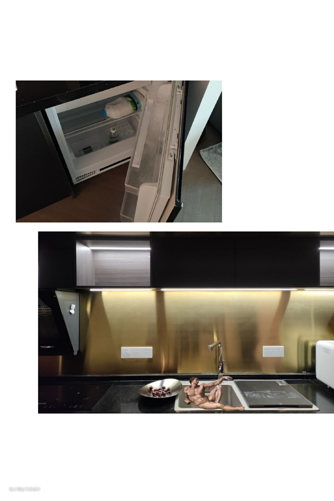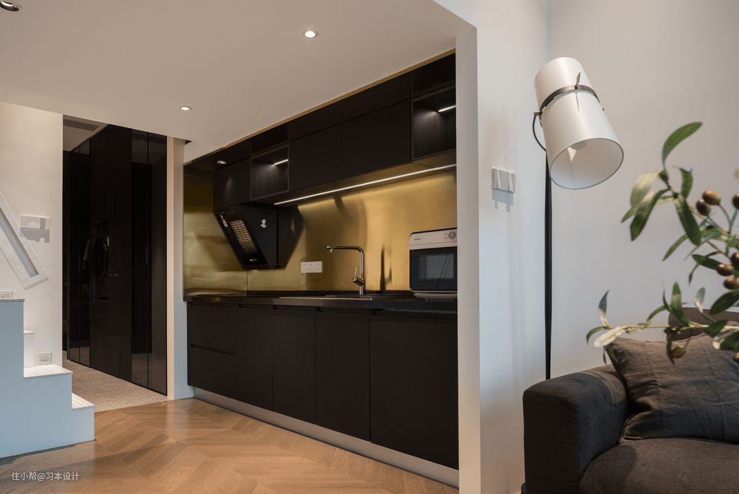 厨房整体以黑色,黄铜色进行设计搭配,更显高级,台面石英石也是黑色,同时也嵌入水槽洗碗机,橱柜下方配置了隐藏式冰箱。#厨房