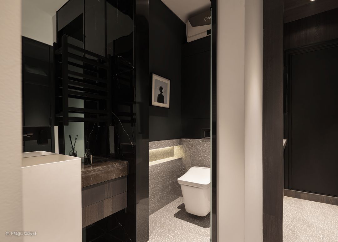 马桶间,砖贴1.2米方便其打扫卫生,其上方利用深色乳胶漆达到更好空间体验。