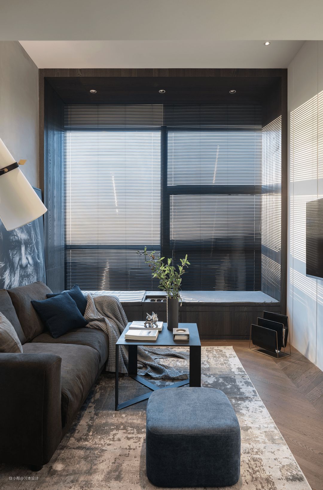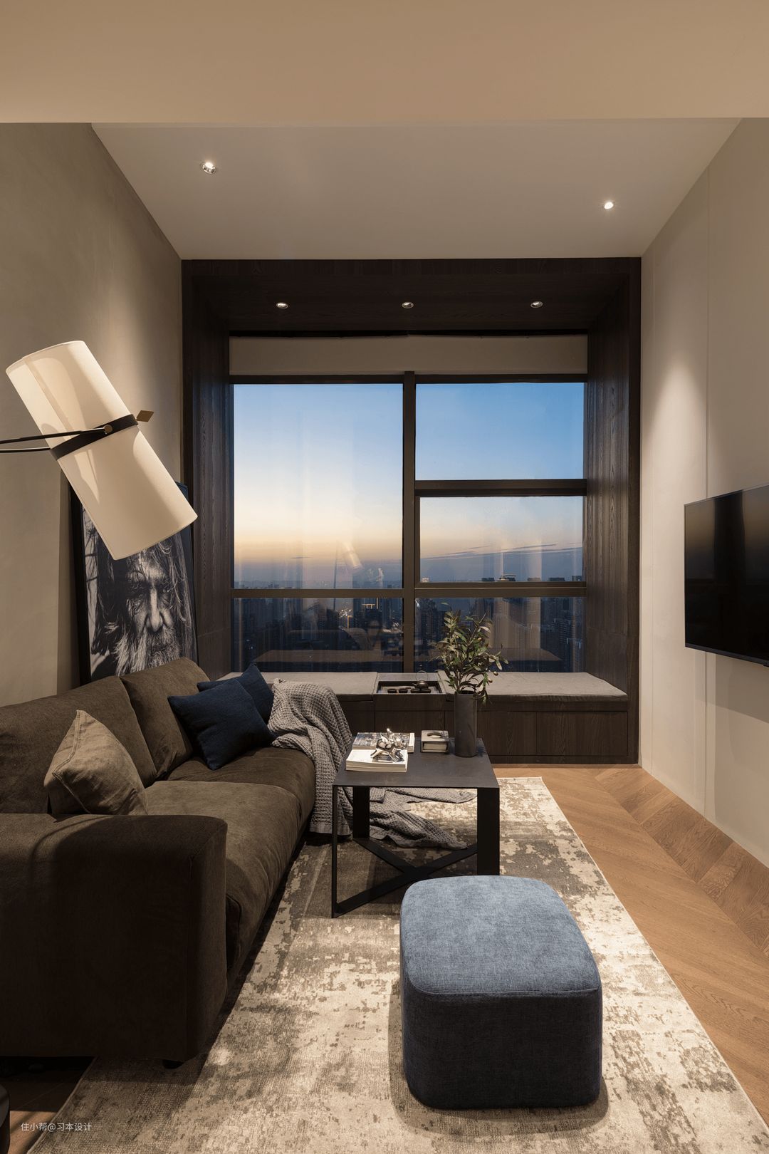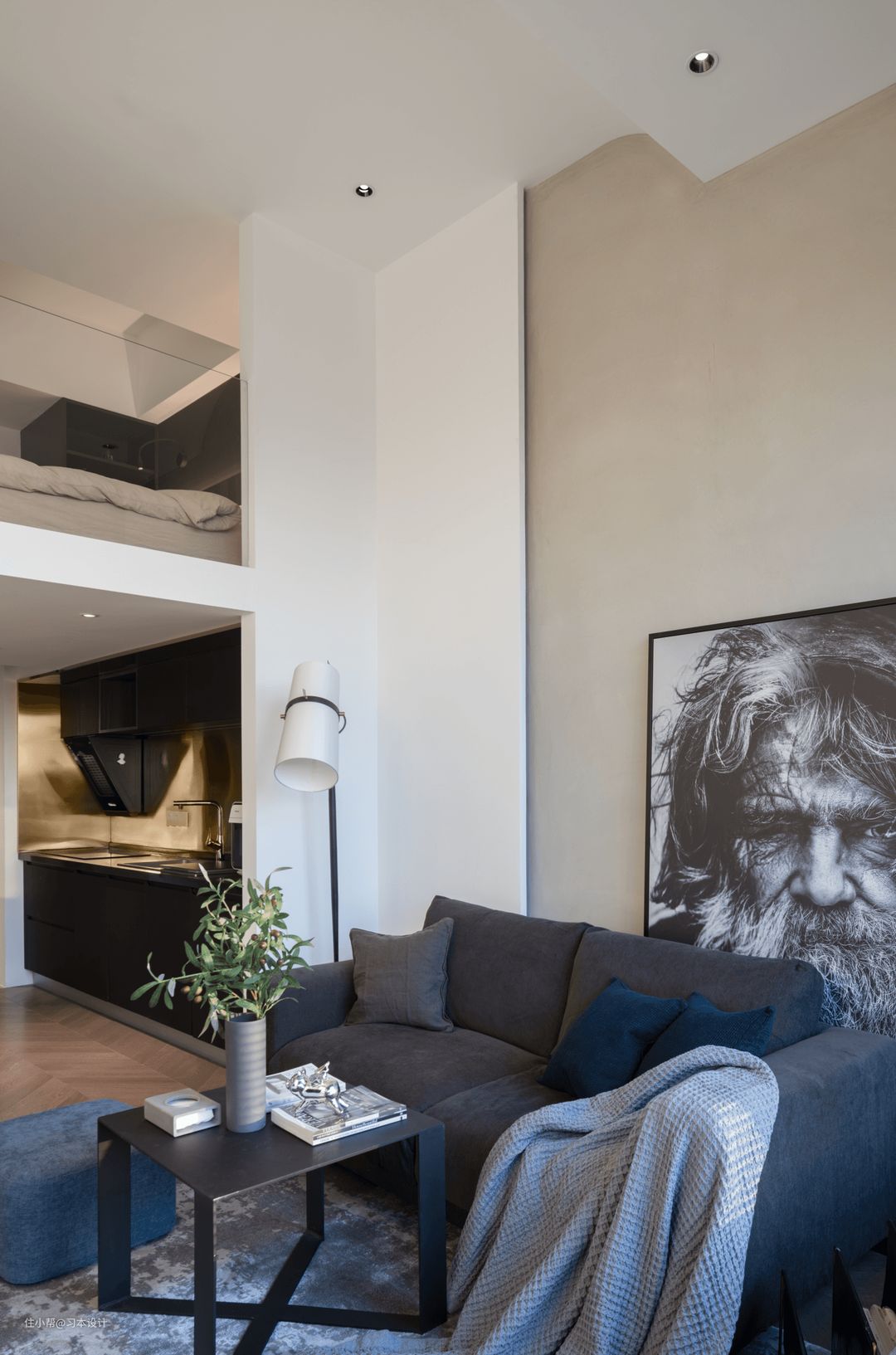 客厅木作挑高卡座,有拔高空间的高度,客厅最多可以容纳4/5人,之所以选择这么笨重的茶几主要是业主在家比较随性,他说太轻,我会踢倒的,哈哈哈这个铁艺茶几他不担心,真的是每个人的生活方式都不一样啊!提醒一点无印良品沙发这款布料是需要定制的。