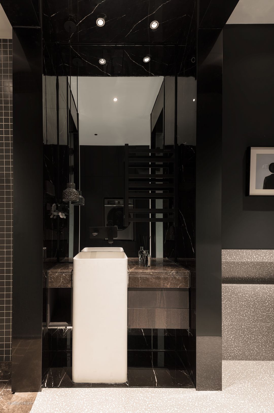 洗漱区,通高的玻璃拉伸视觉效果,立柱面盆提高空间气质,回字形的深色砖,包裹着洗漱区,更明确了其独立划分性。