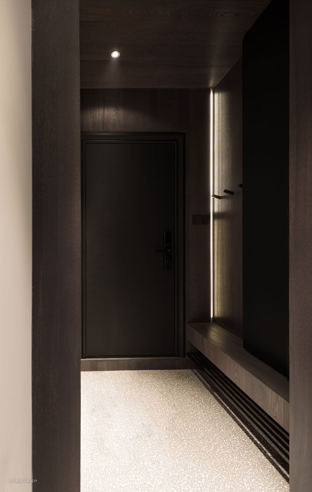 一条线形灯很好的渲染了整个空间,原有的木黄色的入户门改色之后,与整个空间更为融合。木作换鞋凳,可以更最大化的利用空间,下面一层铁艺层板方便放置拖鞋,鞋柜对面是一整面镜子,也非常实用。