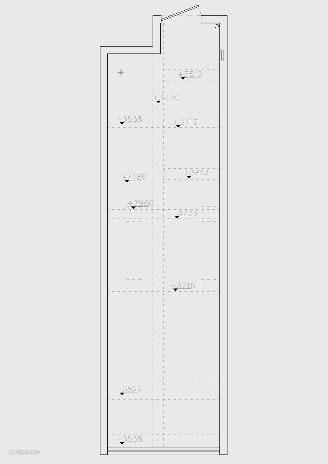 通过图片可以很明白看到 总层高4.150m。 由于 7个横梁 1个竖梁 的分布 导致层高的最低点是3.5m,大部分高度也只有3.7m。 ①:4.15米如果做挑高相对来说比较紧凑。但是也可以做。 ②:3.7m做挑高二层,基本上无法完成。 我们仔细算一下: 3700mm减去 铺贴层50mm + 一楼最低2000mm + 架空层150mm =1500mm 也就是二楼层高仅仅只剩1.5m 这个高度根本无法作为卧室去使用