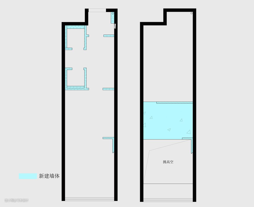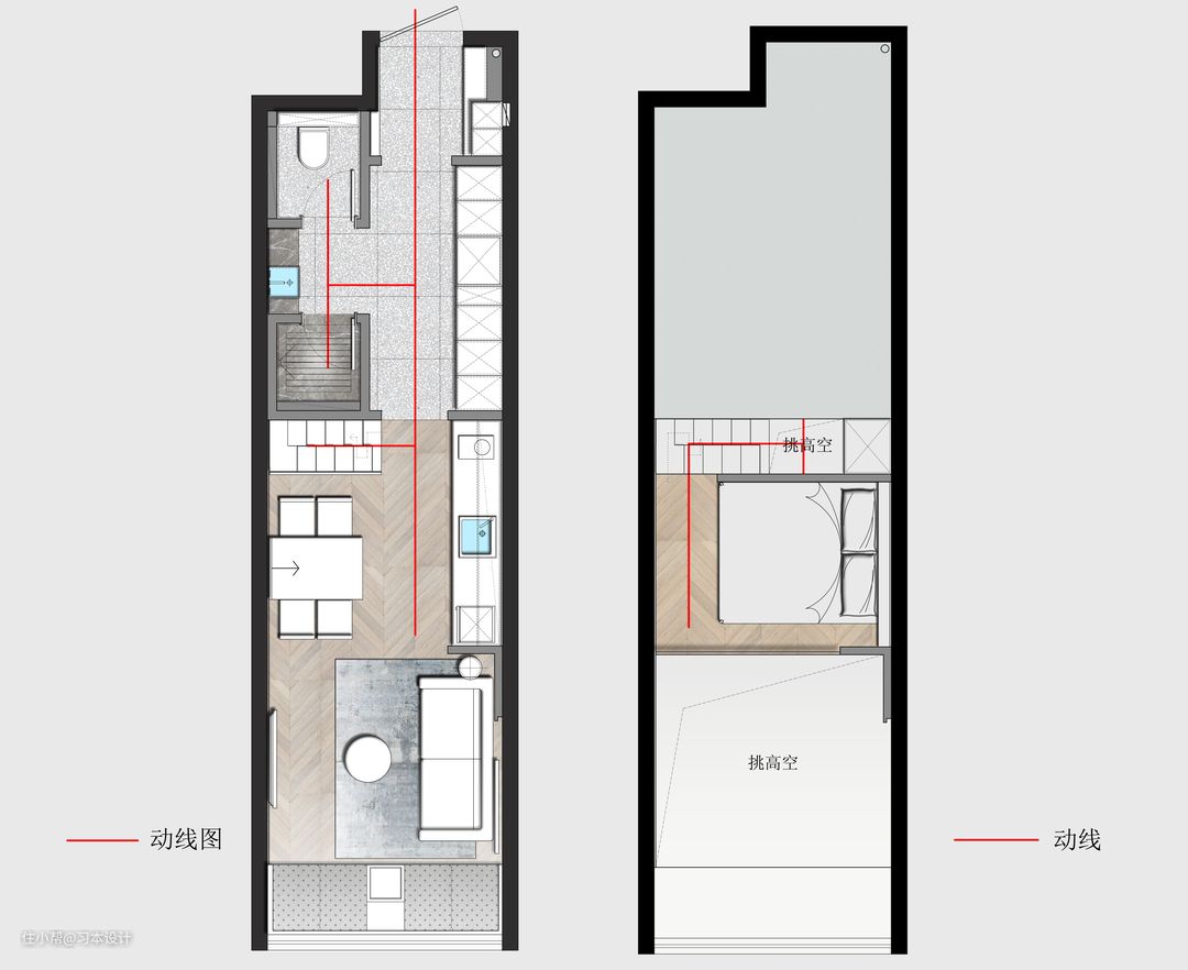 木作挑高造型,可以更好的衔接厨房地柜以及主卧床头,空间方面串联一到二层的视野,具有拉伸空间层高效果。
