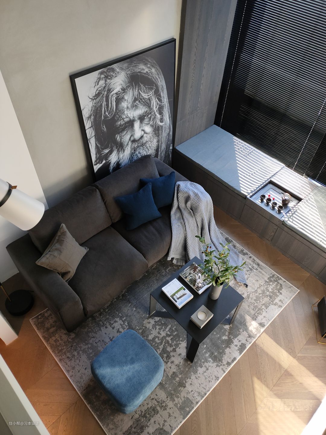 客厅木作挑高卡座,有拔高空间的高度,客厅最多可以容纳4/5人,之所以选择这么笨重的茶几主要是业主在家比较随性,他说太轻,我会踢倒的,哈哈哈这个铁艺茶几他不担心,真的是每个人的生活方式都不一样啊!提醒一点无印良品沙发这款布料是需要定制的。