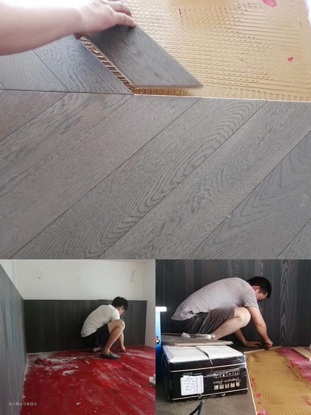 由于二楼本身是钢架结构,不是现浇的,所以地面为了防止木地板不开脱,我们选用木地板胶进行铺贴。