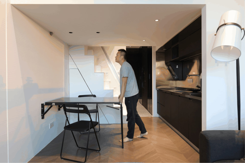 餐厅设计没有固定餐桌位置,使用了壁挂餐桌,在不同状态下,可以调整空间的使用性。楼梯设计了收纳,餐椅是折叠式,用时从楼梯收纳柜里拿出即可。