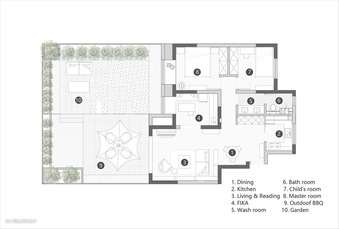 绿植和灯光 晚餐的氛围。院子四周墙都做了绿植,白色的小围墙是保护植物和方便浇花的设计。室外的餐桌上方设计了大尺寸遮阳伞,雨天也可以惬意用餐,在天津这个夏天很长雨季不短的城市实用性很高。
