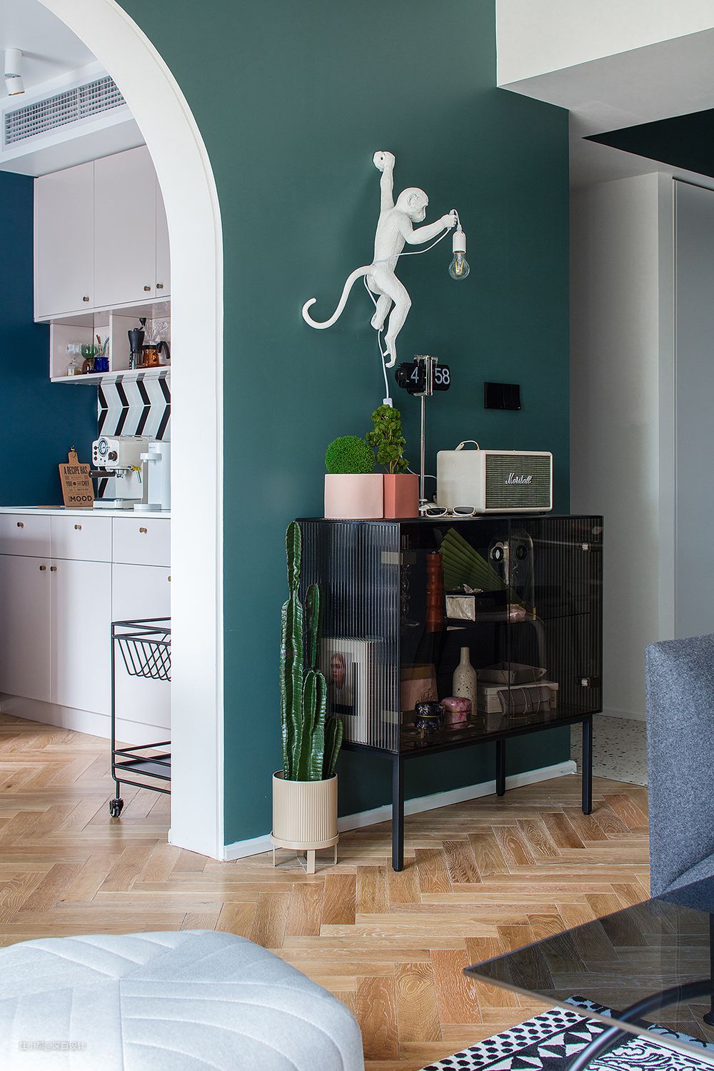 冷色调的空间却充满了家的气息,设计师使用大面积的有色墙营造北欧风情,吊顶和拱门内侧留白,以体块进行区分过渡,书架和沙发等主体家具的深色用木色地板相接,画面色调复古舒服。