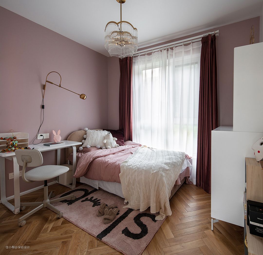 儿童房是充满童心的设计,主题色使用粉和白,粉色大面积使用在墙面,通过白色过渡,床品地毯都采用柔软的针织毛绒材质,打造了一个如梦似幻的公主卧房。这间卧室是一个可爱的小女孩住,我们在颜色和材质选择上,包括家具的尺寸和设计感,都以一个孩子的喜好角度去考虑。