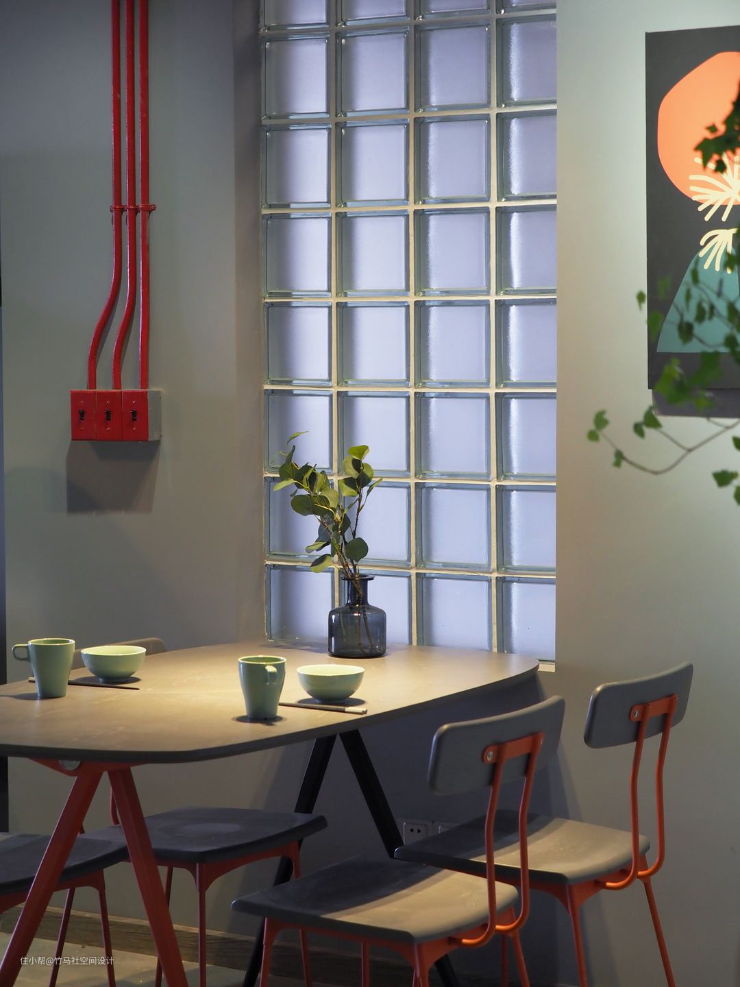 客厅的茶几也加入了红色钢管元素。