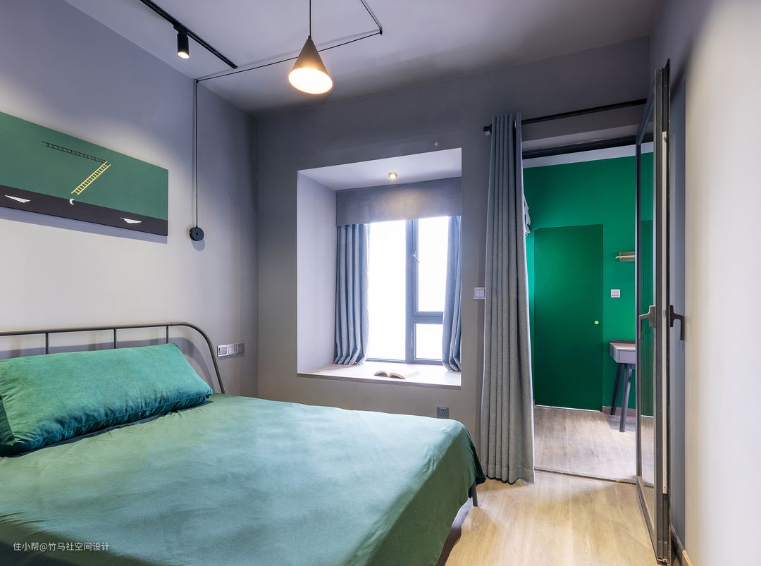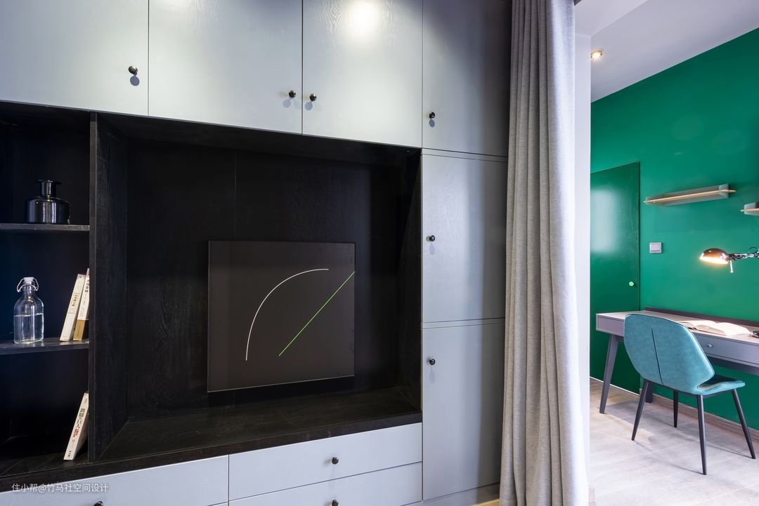 书房成为了卧室区域的延伸,主卧室的墨绿色调和书房相互呼应。