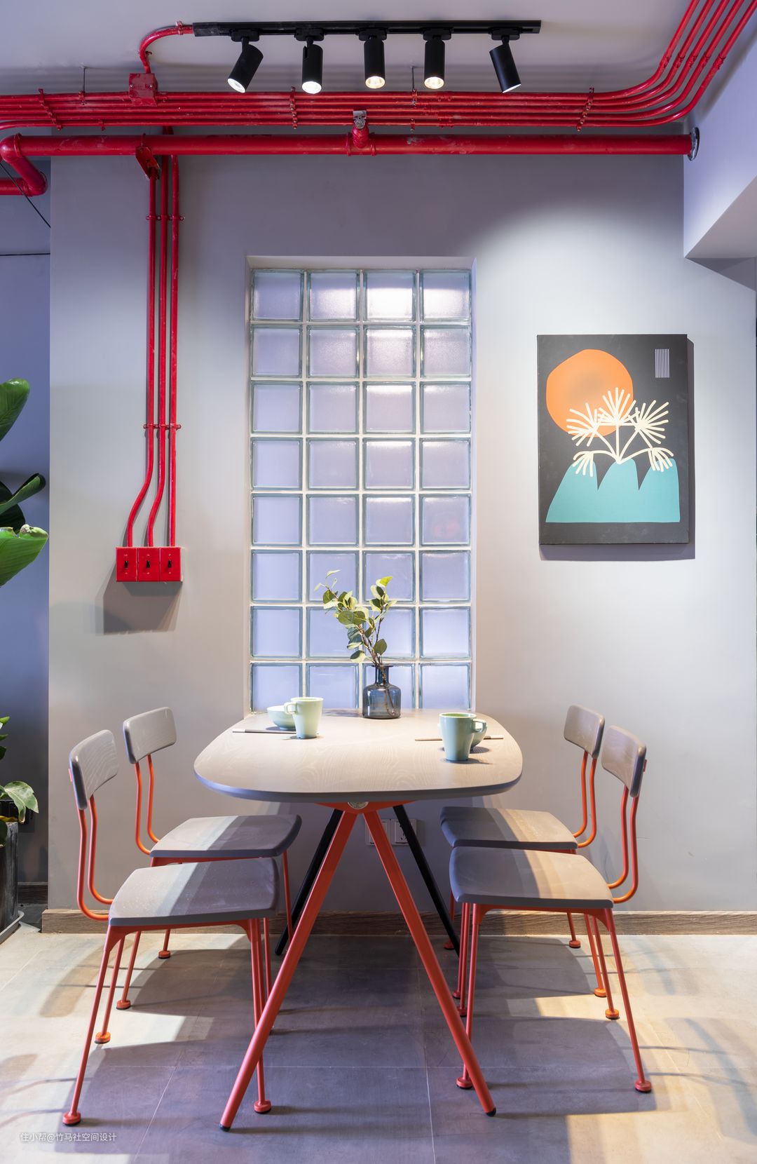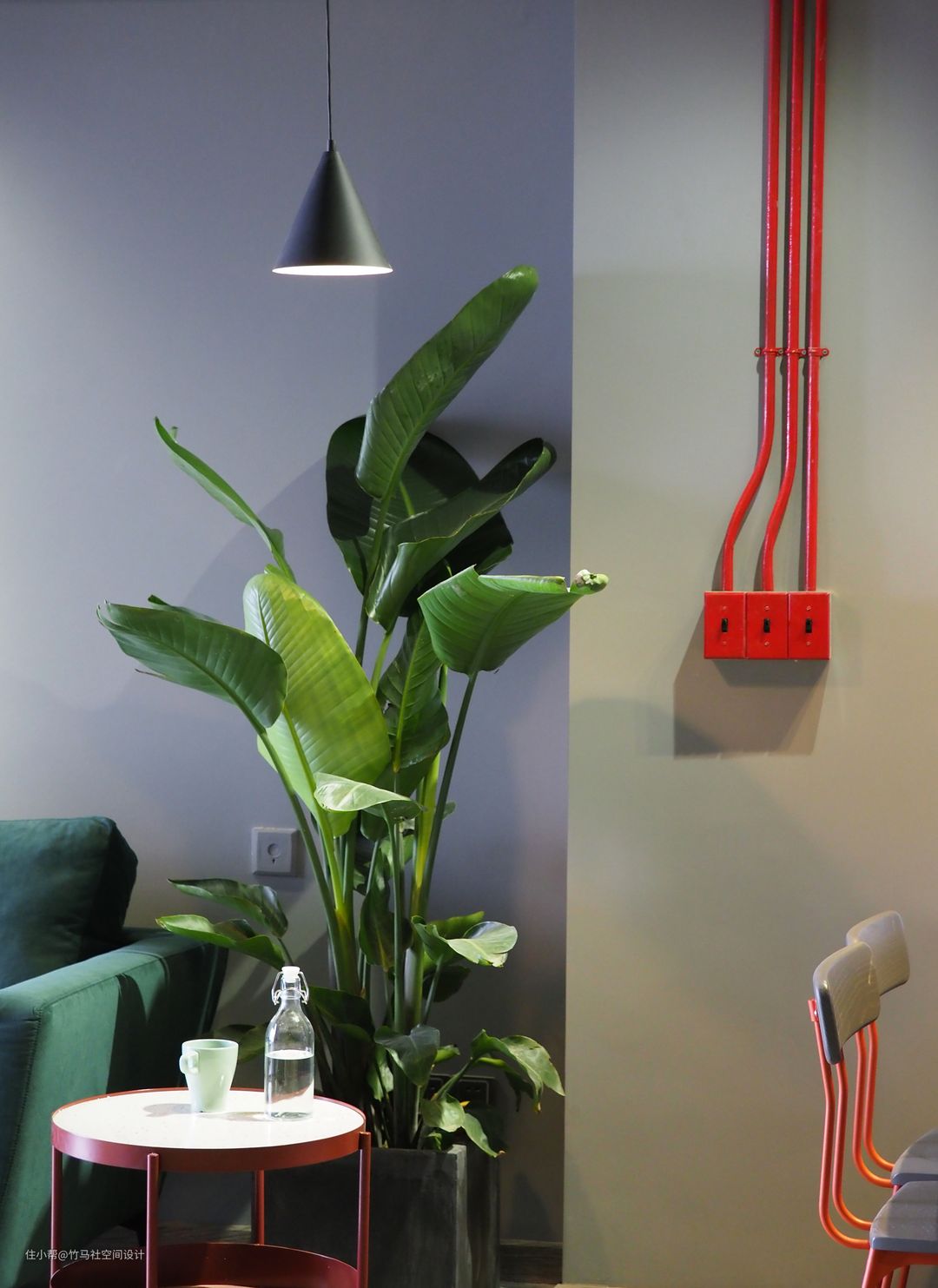 明装复古工业开关搭配红色钢管桌椅,工业感十足。